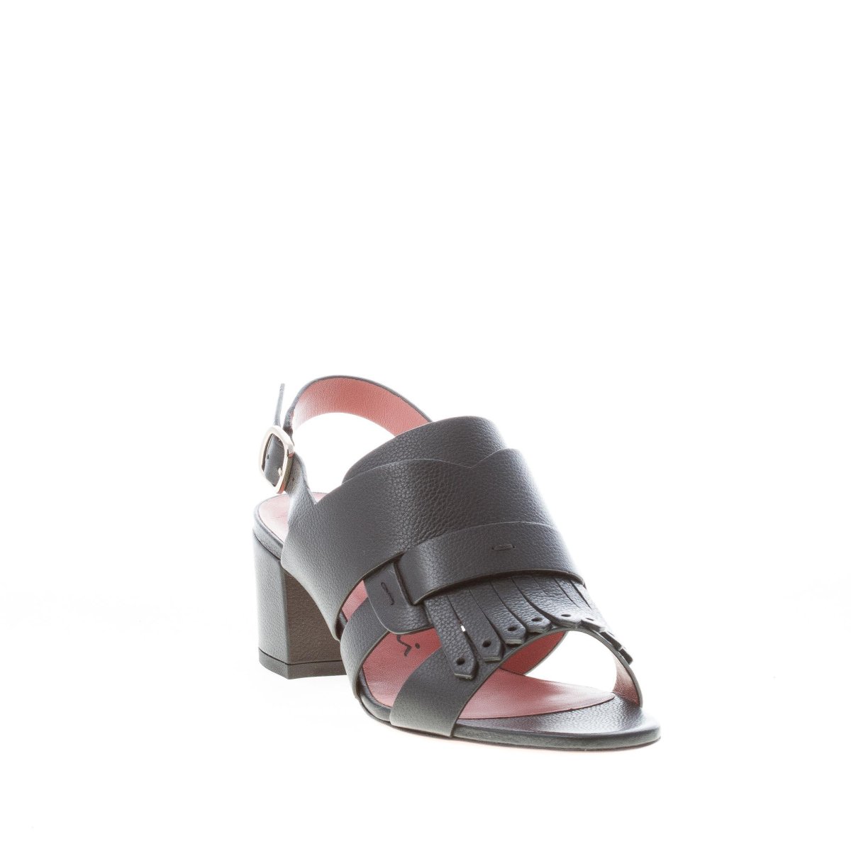 SANTONI donna sandalo in pelle martellata NERO con fascia accollata e frangia. Tacco 5,5 cm