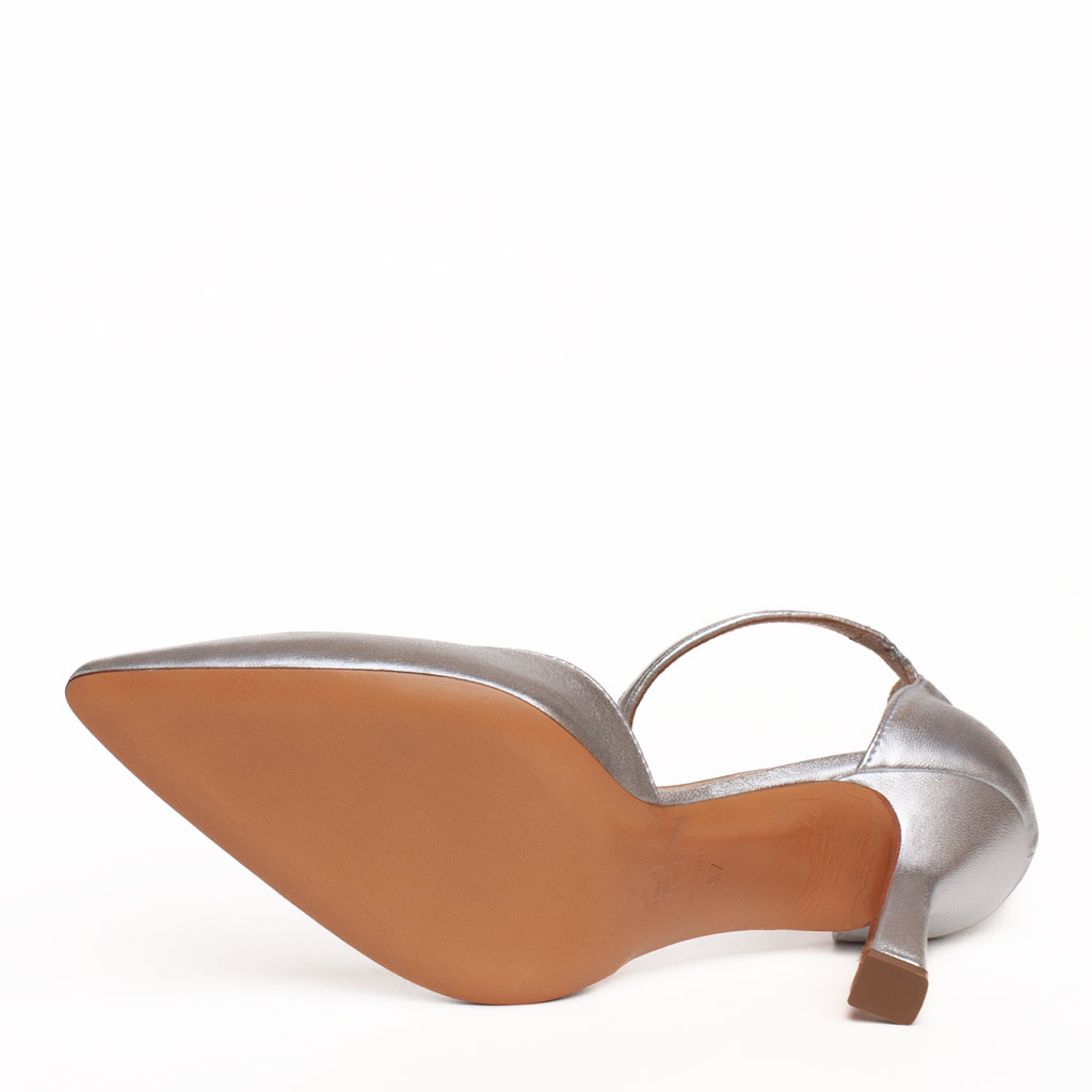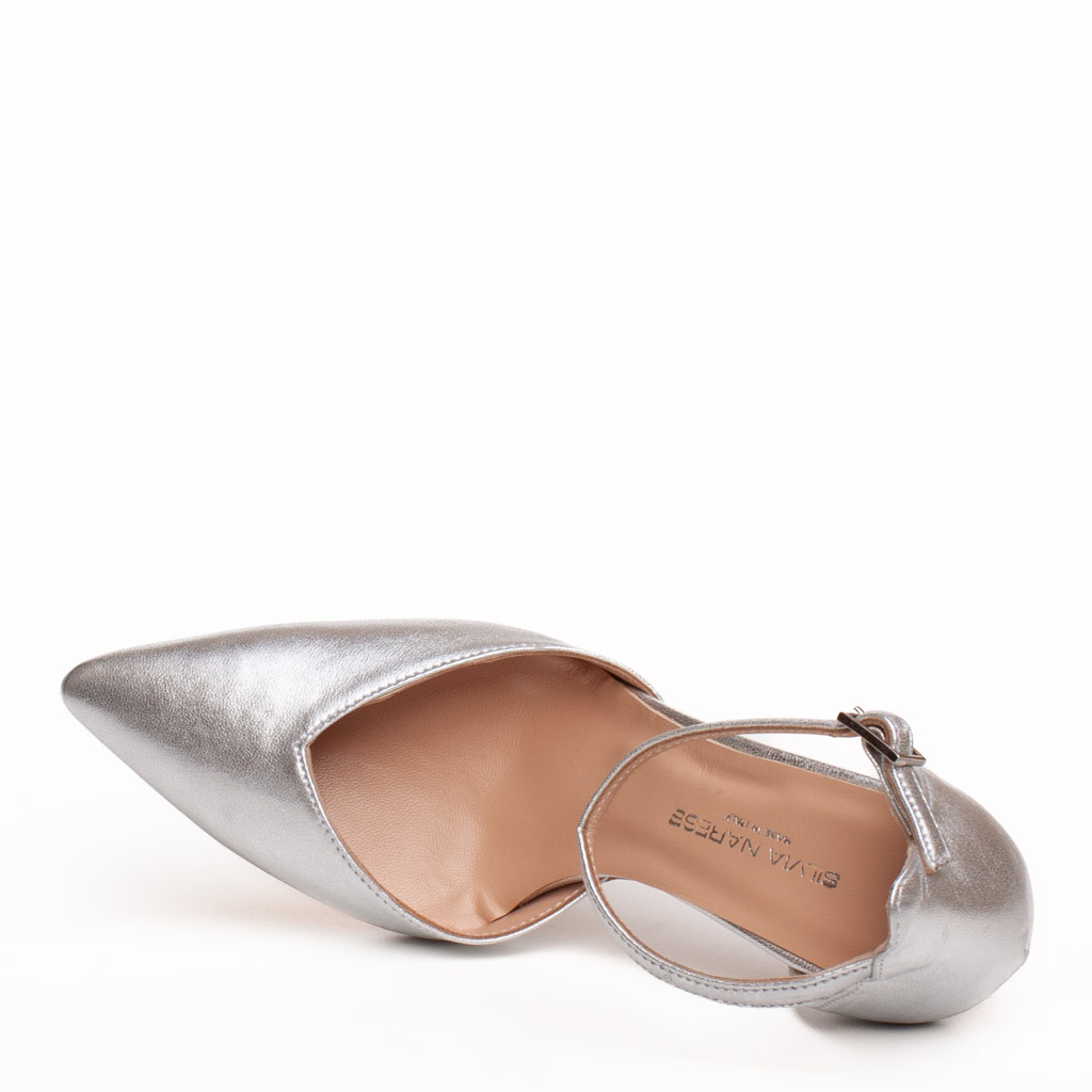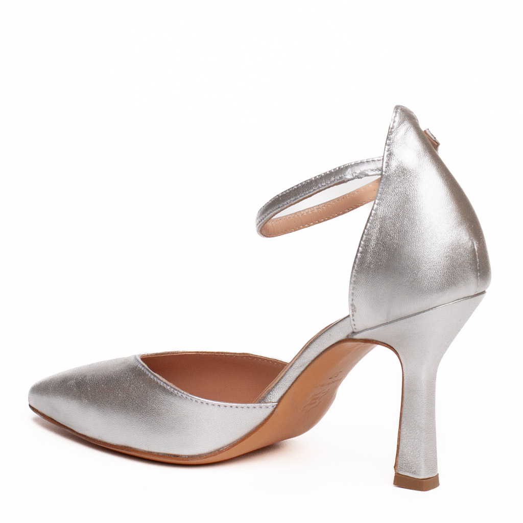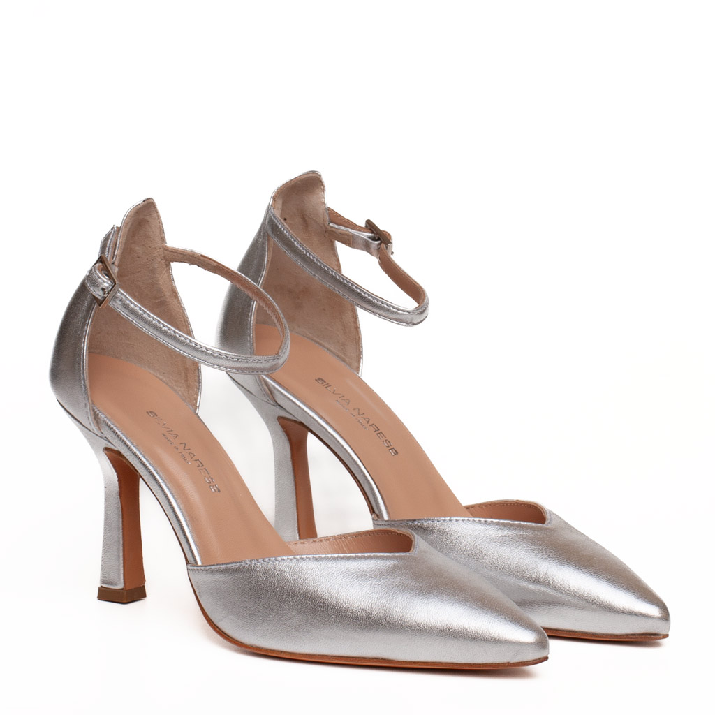 Splendide dรฉcolletรฉ a punta con tacco alto e cinturino alla caviglia, realizzate in pelle laminata color argento. Un modello elegante e raffinato, ideale per completare il tuo look da cerimonia o per una serata speciale. Un vero gioiello Made in Italy. Altezza tacco 9 cm.ย Made in Italy.
