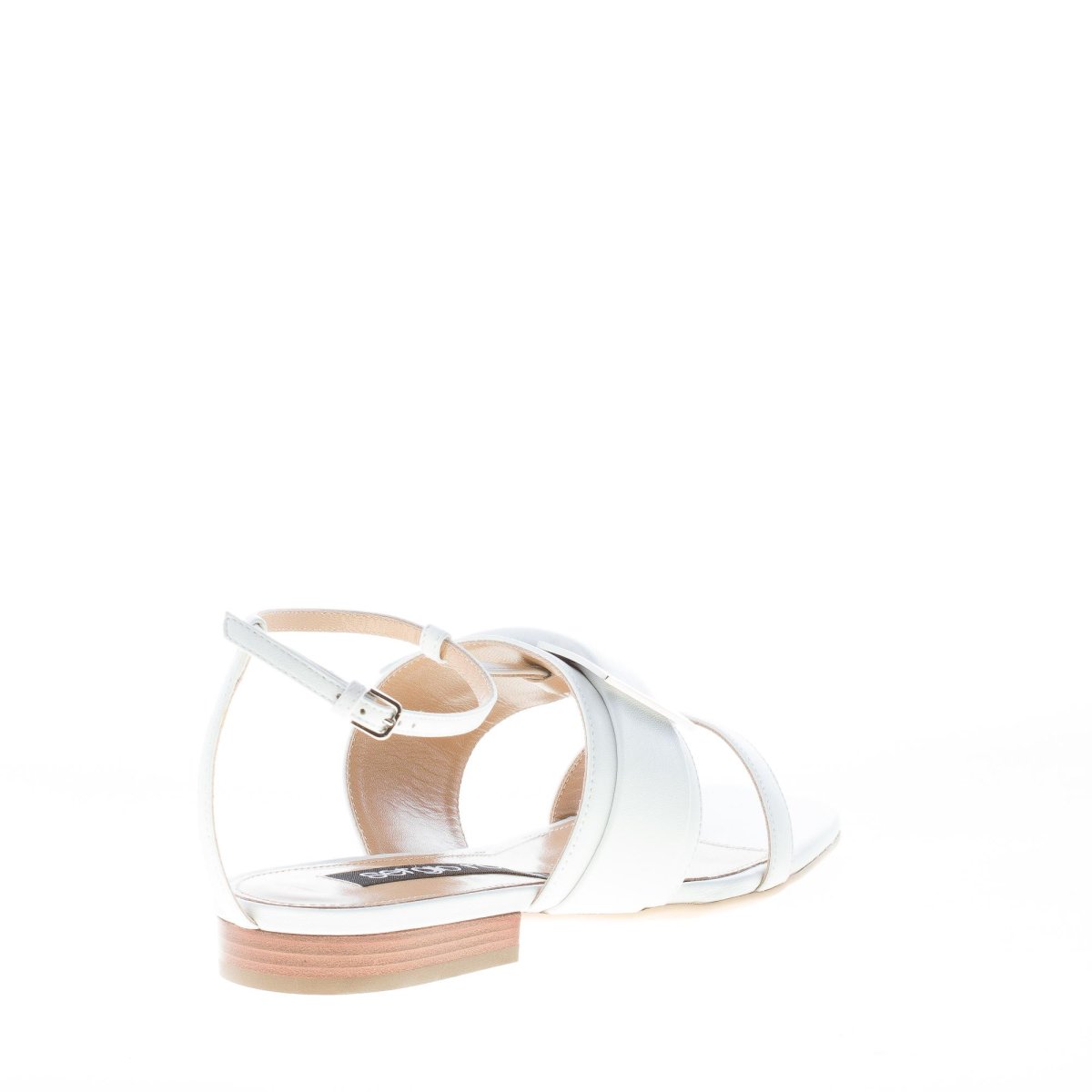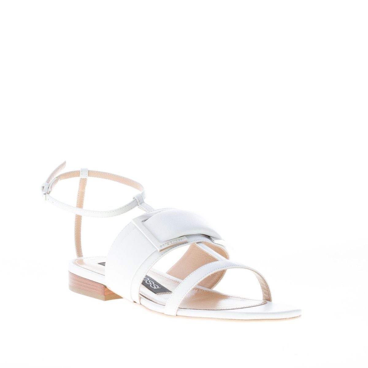 Sandalo piatto della linea SR Prince realizzato in pelle bianca con T-Design e larga fascia decorata da una maxi fibbia brandizzata in metallo argento. Chiusura con cinturino alla caviglia e fibbietta regolabile in metallo. Suola flat in cuoio. Tacco di 1,5 cm