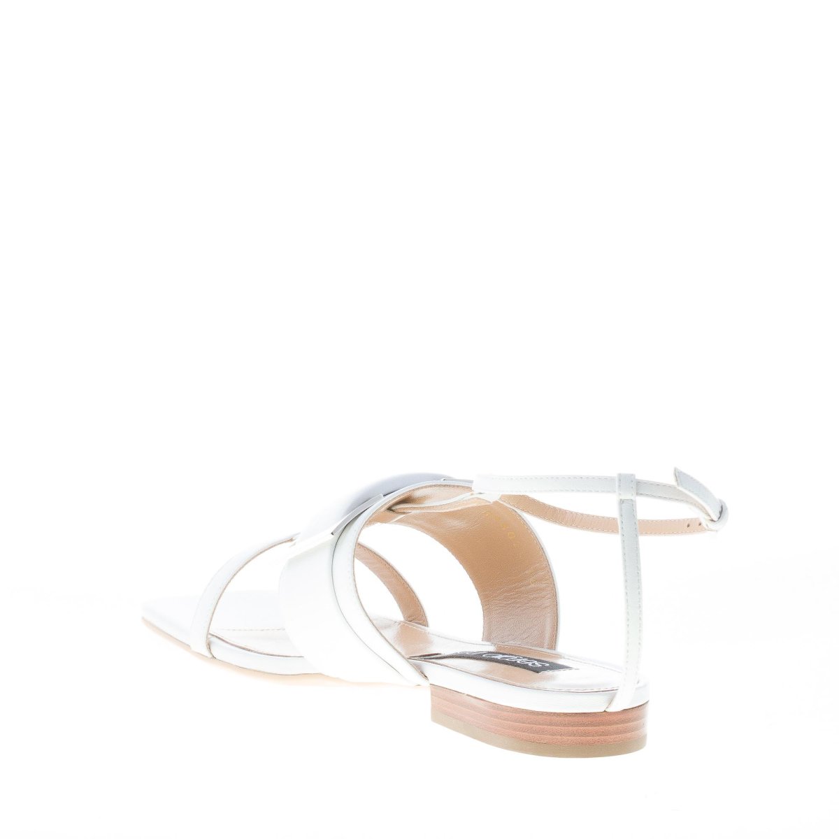 White leather SR1 Prince flat sandal with a T-Strap design and a front large strap decorated with a silver metal branded maxi buckle. Ankle strap closure with an adjustable silver metal buckle. Leather flat sole. Heel 1,5 cm