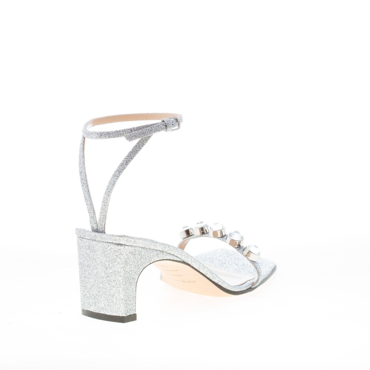Silver glittered fabric SR1 sandal with a squared toe and a crystals decorated thin strap. Anckle strap closure with a V design at back. Leather sole. Heel 6 cm