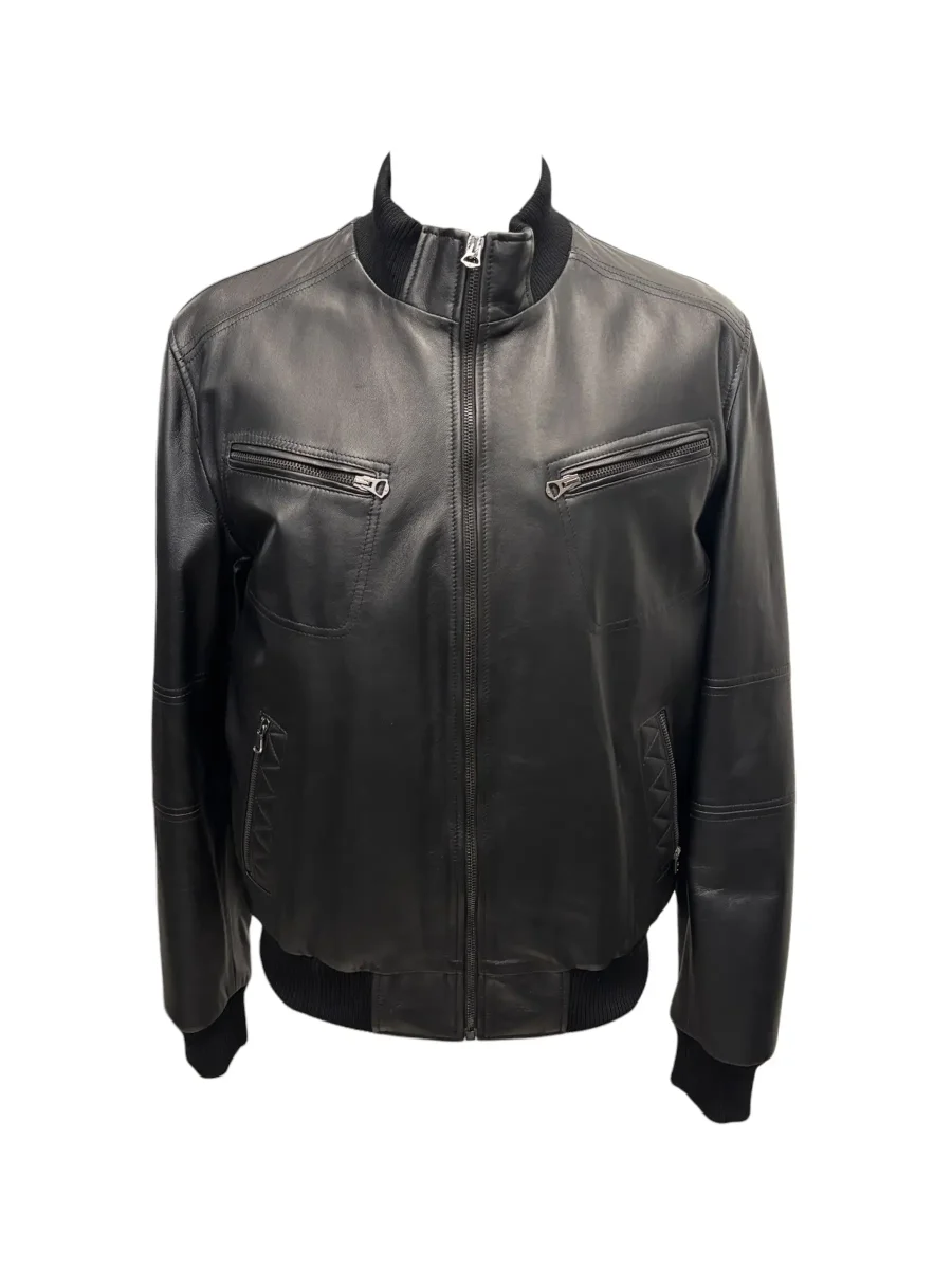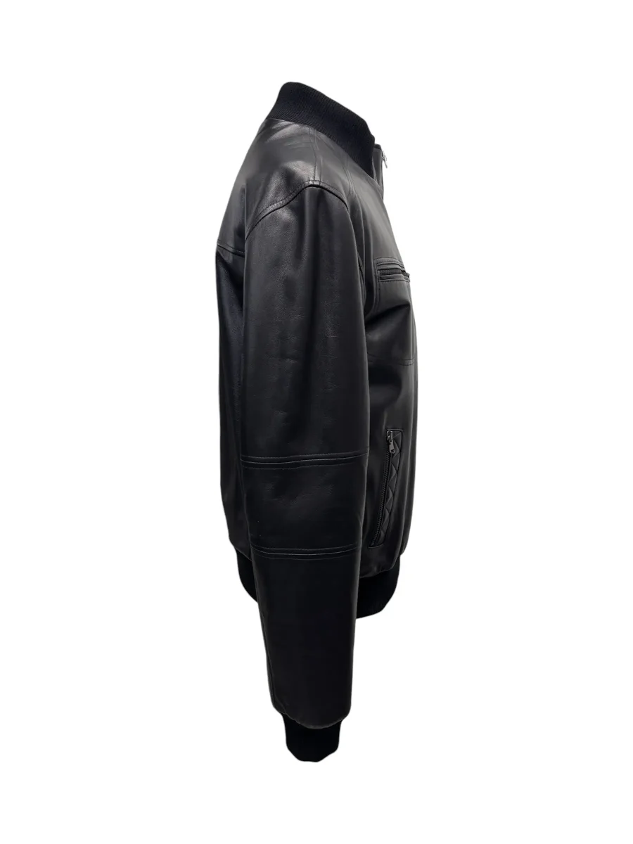 Bomber in pelle nera da uomo, lavorazione artigianale Made in Italy. Realizzato in morbida pelle nappa,ย questo capo offre una sensazione di lusso al tatto e una resistenza eccezionale nel tempo. Chiusura centrale con zip robusta. Collo, polsini e fondo in maglia elastica a costine nera. Due tasche pettorali con chiusura a zip orizzontale e due tasche laterali a filetto con dettaglio ricamato a trama geometrica e chiusura zip.