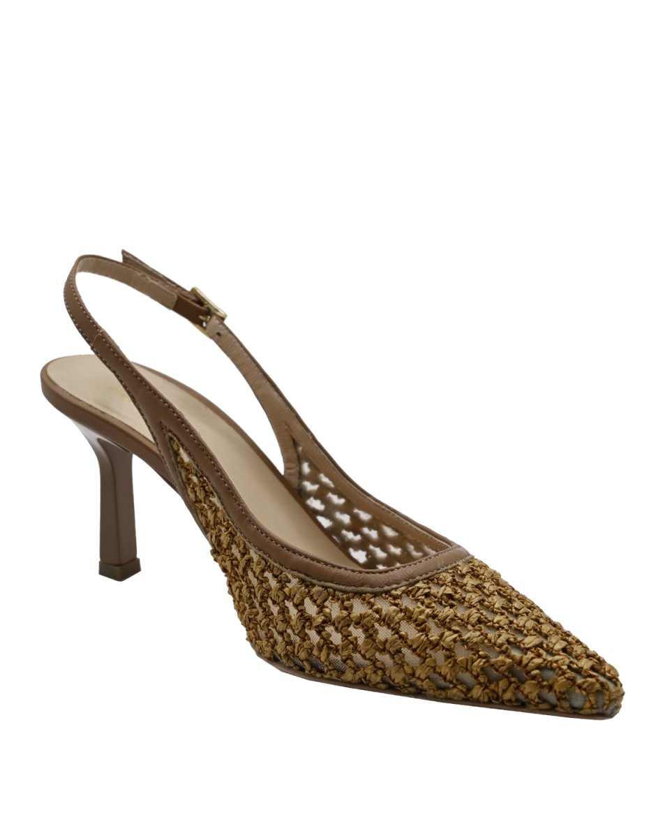 Il tacco sottile da 7,5 cm dona slancio alla figura senza sacrificare la comoditร , mentre la suola in vero cuoio conferisce soliditร , flessibilitร e durata nel tempo. Il modello slingback con cinturino aperto sul tallone rende la calzatura fresca e ideale per i mesi estivi, abbinabile tanto a un abito leggero quanto a un tailleur in lino.