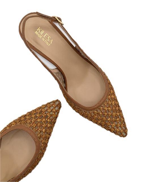 Naturali nei materiali, sofisticate nello stile: le Slingback Rafia Cuoio firmate KILESA sono un omaggio alla femminilitร estiva e alla maestria artigiana italiana. Realizzate in un elegante mix di vera pelle di vitello e raffia intrecciata, si distinguono per il loro look caldo e raffinato, perfetto per le giornate luminose e gli appuntamenti chic.