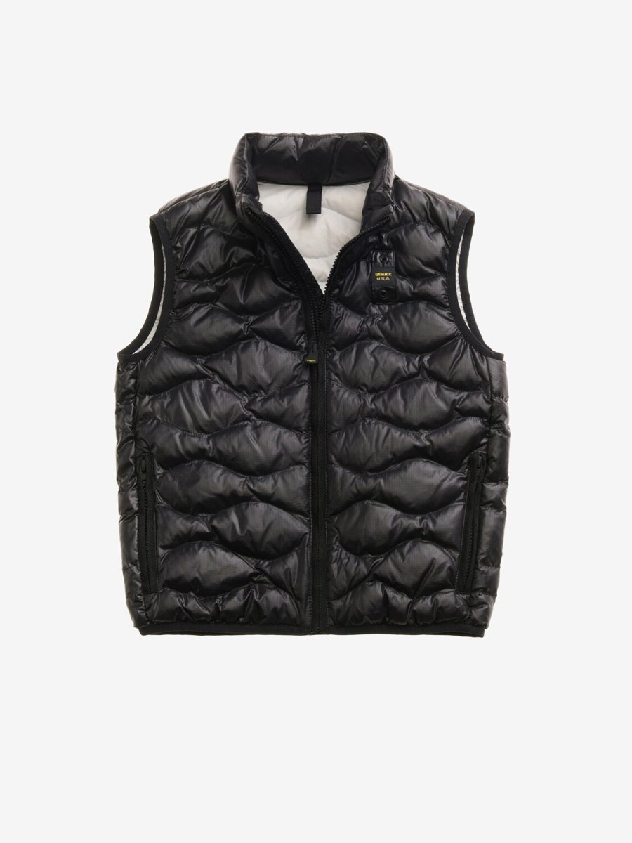 Giubbetto senza maniche con leggero motivo check, imbottitura sostenibile impunturata ad onde e fodera in contrasto colore Chiusura con zip Imbottito ovatta Sorona® Due tasche con zip Profilo in lycra sul giro maniche e fondo Tasche interne con velcro Passante con logo