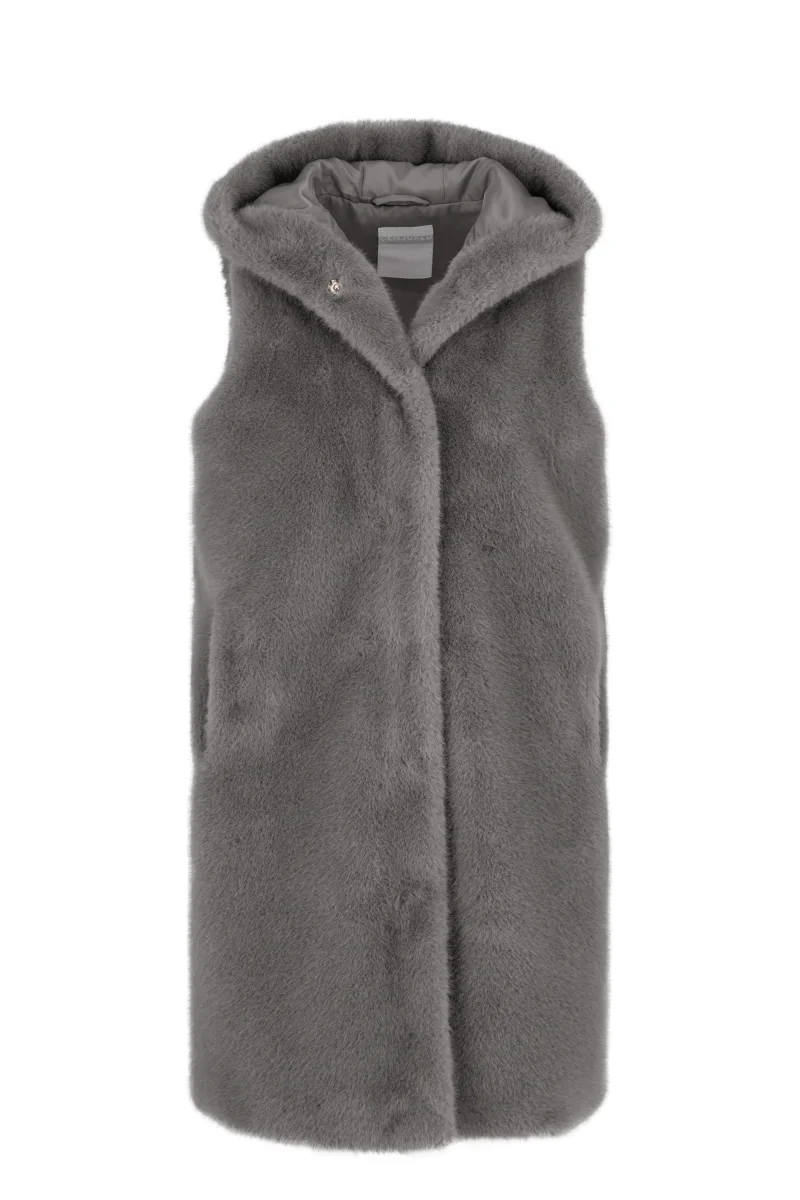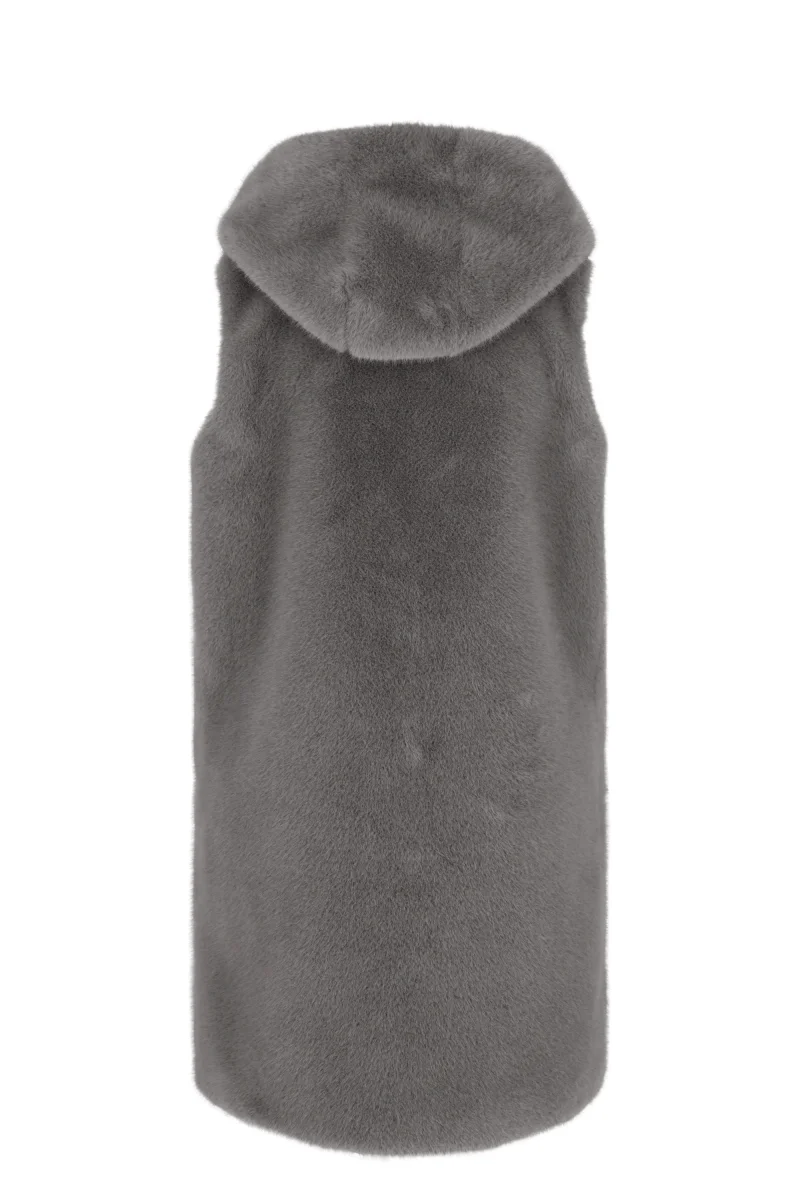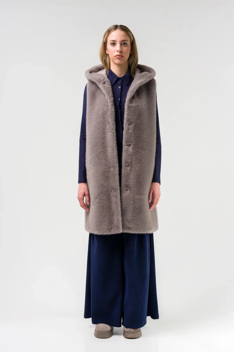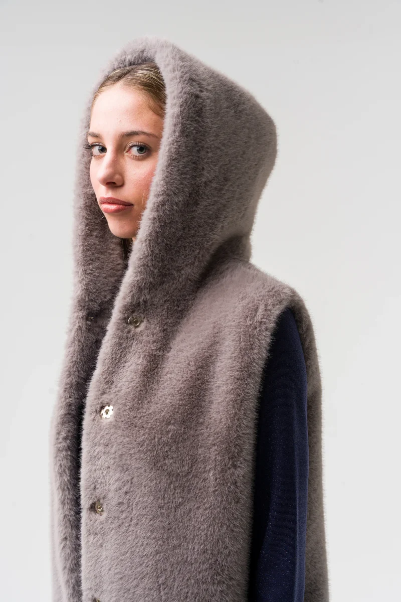 Smanicato in morbida ecopelliccia con cappuccio. La fodera interna garantisce resistenza e durata, mentre i bottoni a pressione e il design senza maniche ne esaltano lo stile moderno e versatile, ideale per le sovrapposizioni.