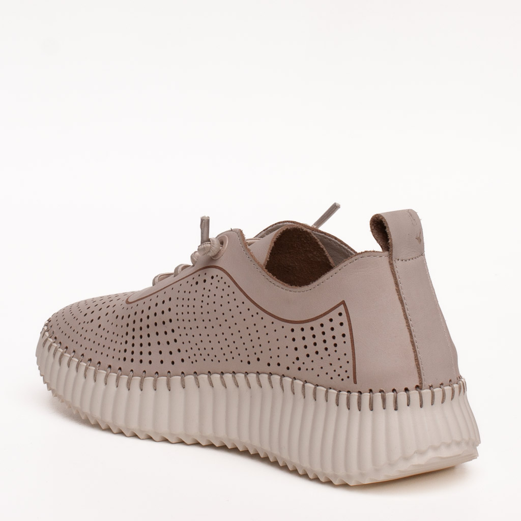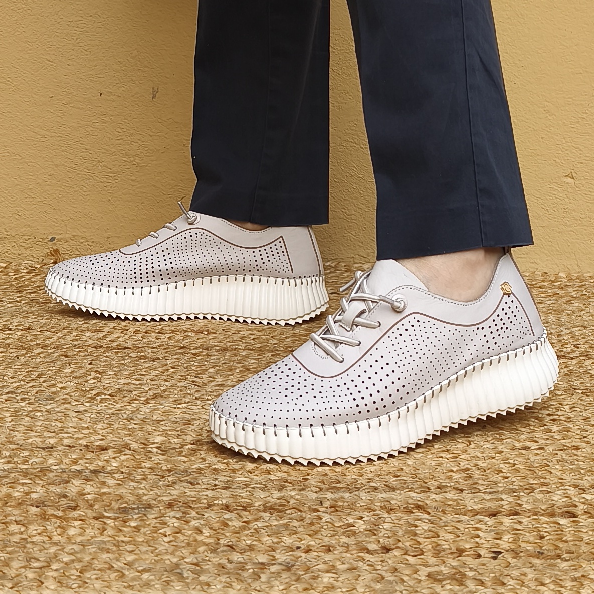 Scarpa in pelle traforata. Allacciata. Sneakers in pelle con suola in gomma . Suola con zeppa in gomma alta 4 cm, plateau 3 cm.ย Soletta in pelle.
