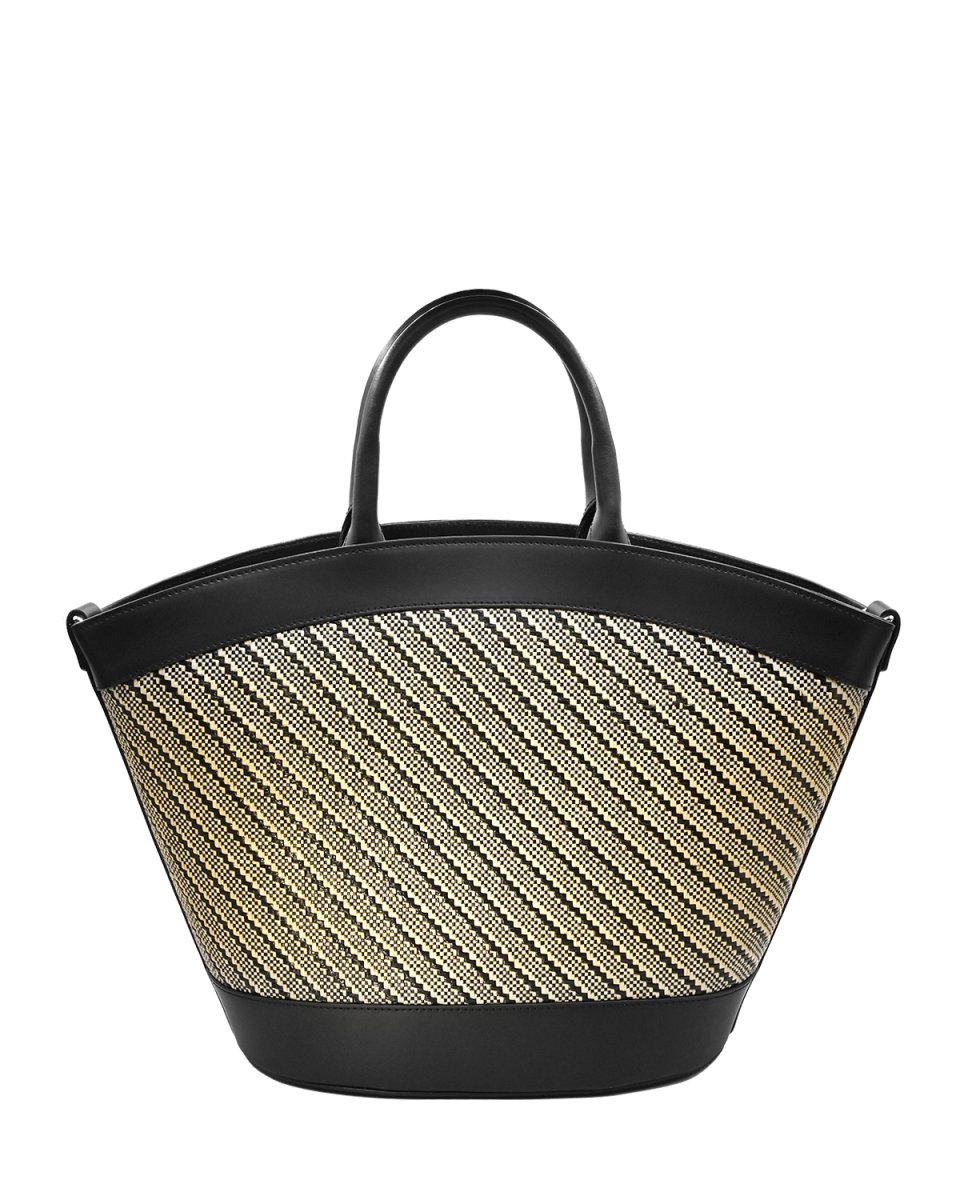 Materiali: vera pelle di vitello e rafia Chiusura con zip e fodera interna in tessuto Tasca interna portaoggetti Dimensioni: 28 x 13 x 25 cm