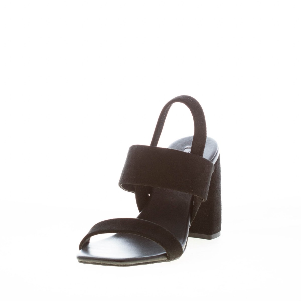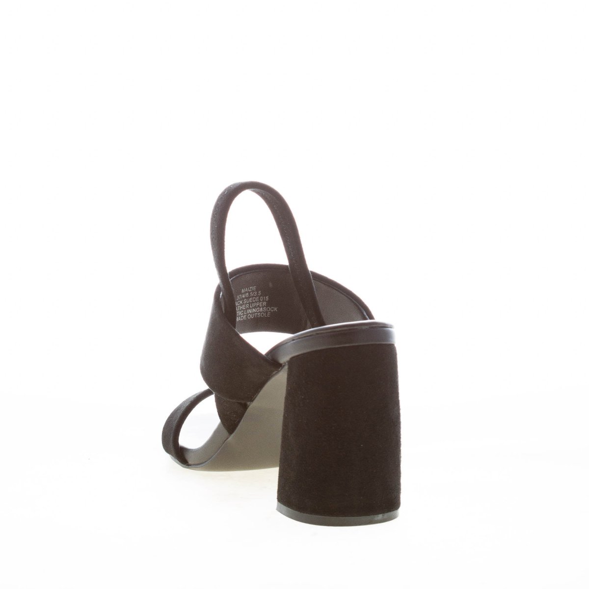 Sandalo Maizie realizzato in camoscio nero con doppia fascia. Chiusura posteriore con cinturino elasticizzato.ย Tacco a blocco di 8,5 cm. Suola in sintetico