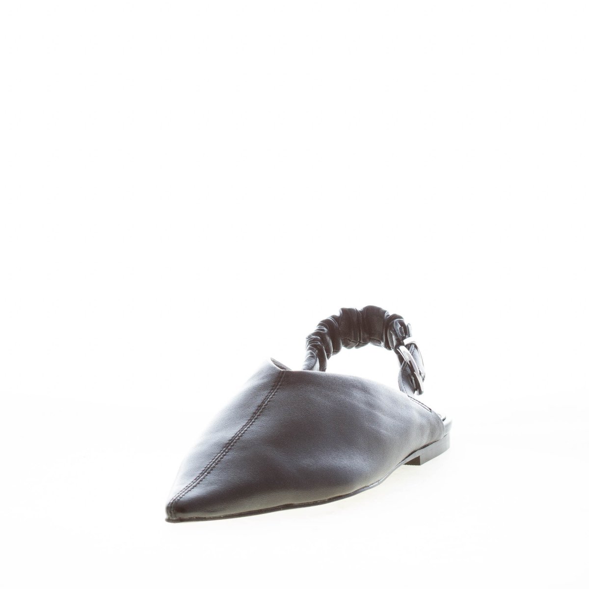 Ballerina slingback Zeta realizzata in pelle nera con design a punta. Chiusura posteriore con fascetta elasticizzata e fibbia argento regolabile.ย Suola in sintetico