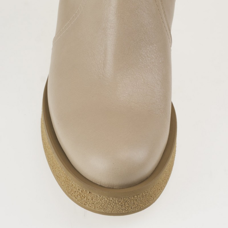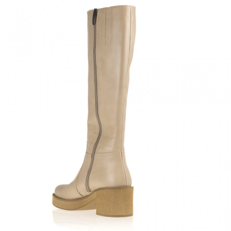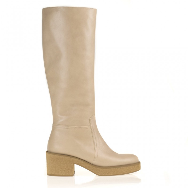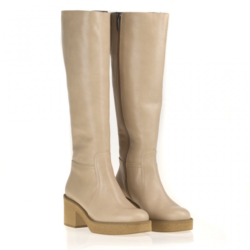 Stivale inย pelle conย cernieraย laterale.ย Suola in gomma, taccoย alto 5.5 cm, plateau 2 cm. Altezza gambale 38 cm. Fodera in pelle.