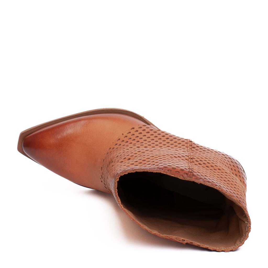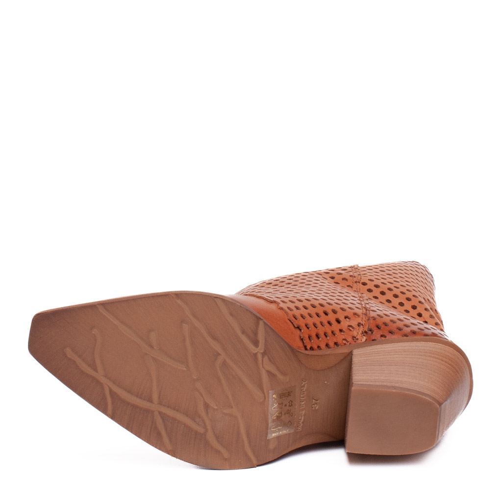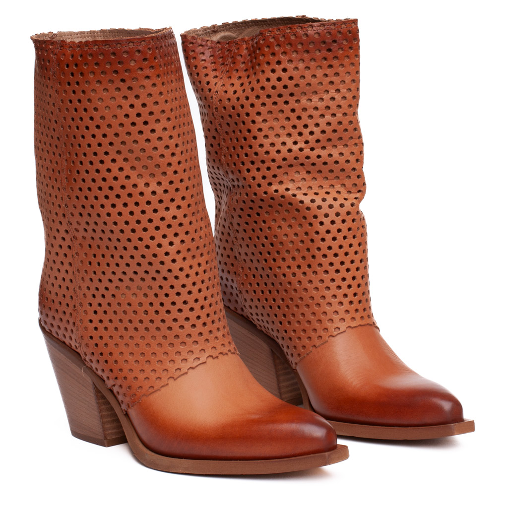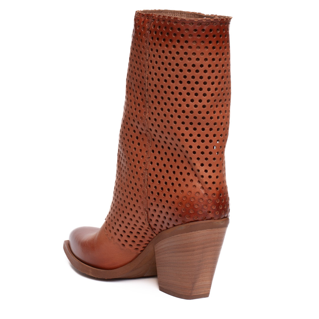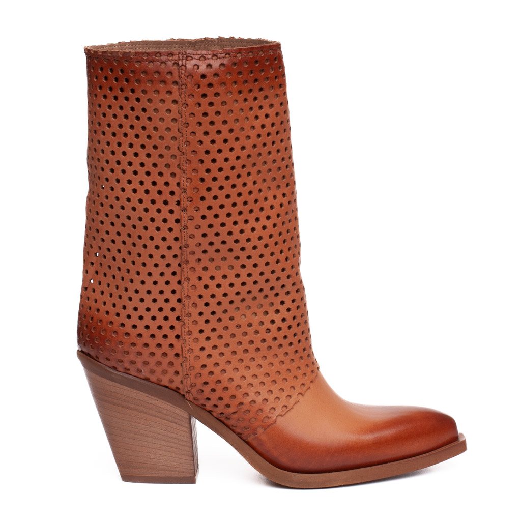 Stivale texano in pelle traforata con la punta affusolata e tacco alto 7 cm. Gambale a tubo. E’ l’abbinamento perfetto con una minigonna o un paio jeans . Realizzato artigianalmente in Italia.