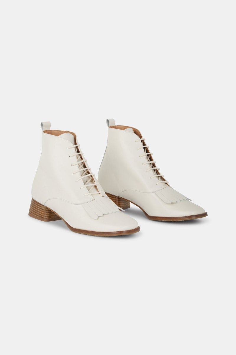 Stivaletto color bianco gesso in stile derby con gambale basso, con dettaglio di frange sulla punta, tacco largo alto 3cm. Queste scarpe uniscono stile , originalitร e massimo comfort, una volta indossate non le toglierete piรน! Indossate con un completo daranno un twist al look. Questo modello di scarpe รจ progettato per tutti i tipi di piede e corrisponde perfettamente alle misure. Ti consigliamo di selezionare la tua taglia europea standard. Per pulire tomaia, fodera e sottopiede utilizzare un panno umido e ben strizzato. Stringhe in cotone cerato Altezza del tacco di 3 cm misurata dalla parte centrale, non dal…