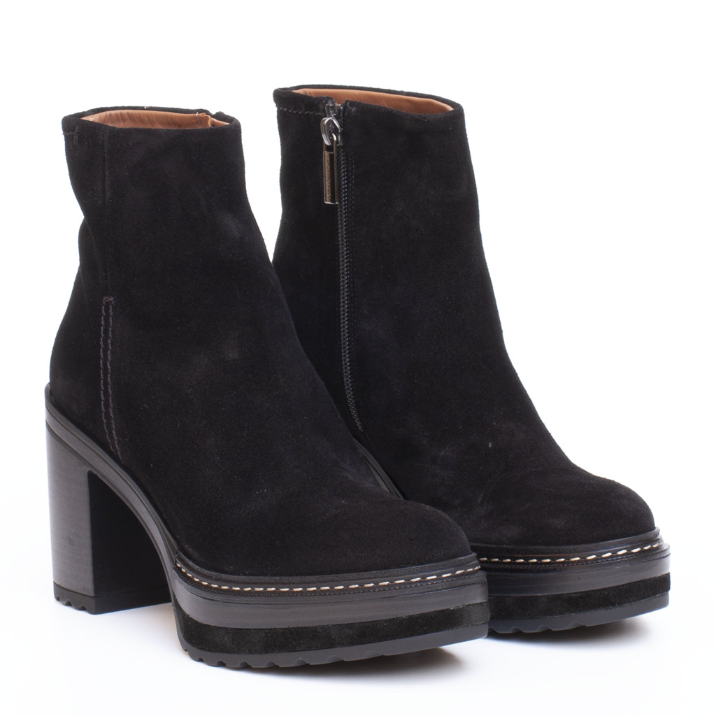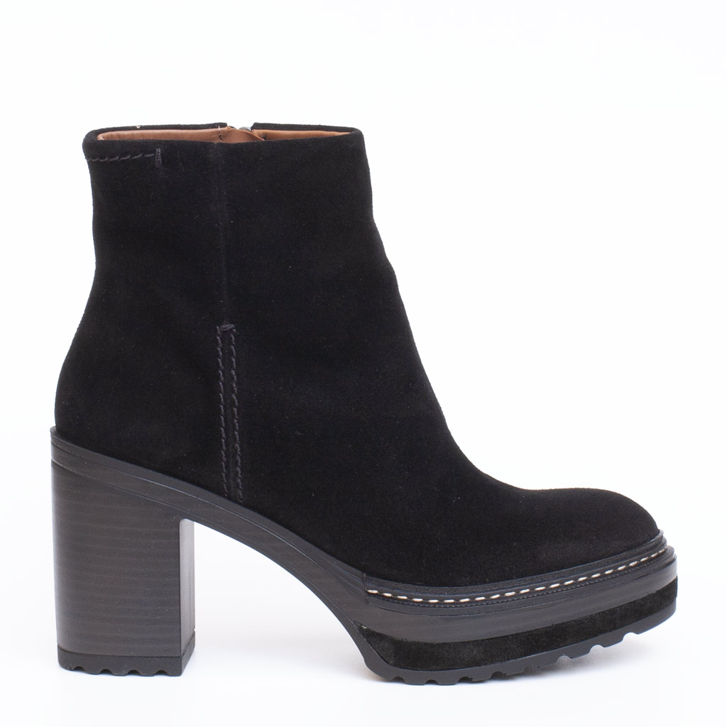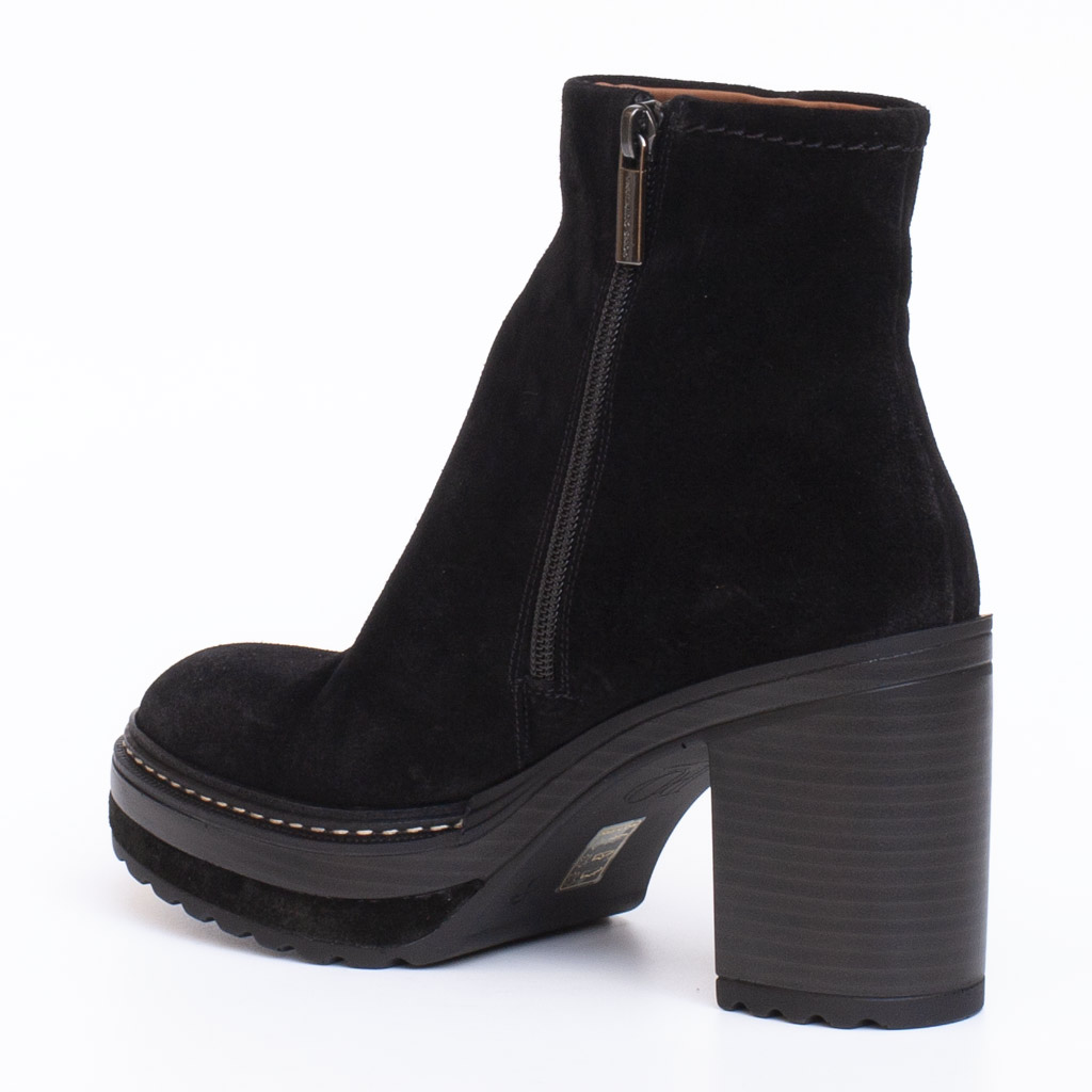 Stivaletto con cerniera laterale in camoscio. Altezza tacco 9.5 cm. Plateau 4 cm. Suola in gomma effetto track. Fodera in pelle. Made in Spain.