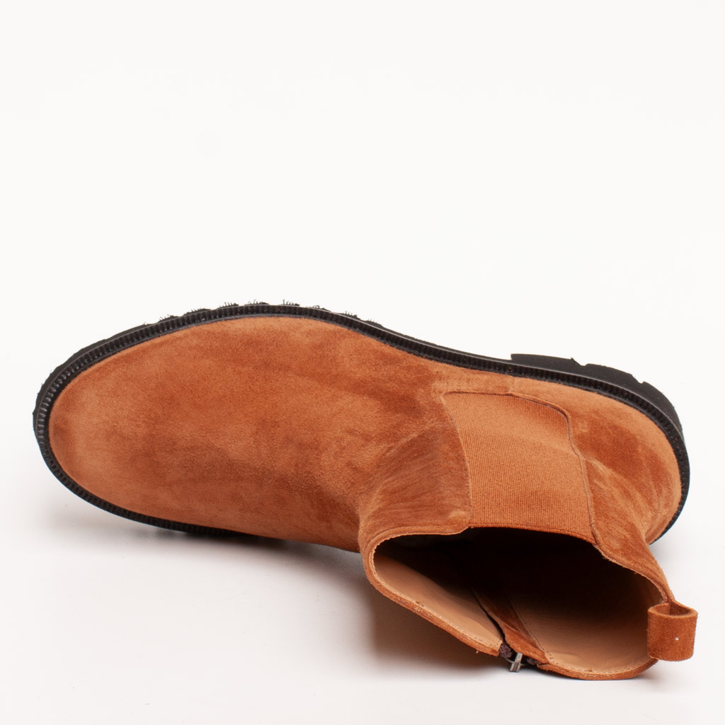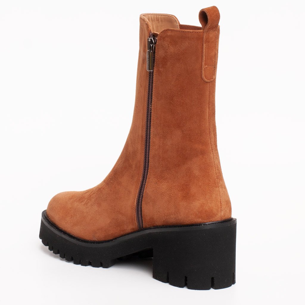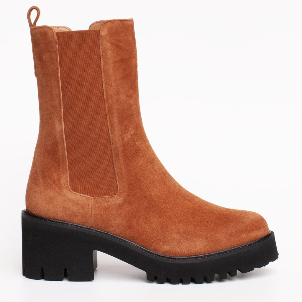 Questo stivaletto cognac tacco gomma si distingue per la sua realizzazione in pregiato camoscio color cuoio o cognac, una tonalitร calda e vibrante, facile da abbinare. Il design รจ ispirato al classico modello Chelsea, ma arricchito da una cerniera laterale che facilita la calzata. Inoltre, l’elastico laterale tradizionale assicura una vestibilitร aderente e confortevole attorno alla caviglia. La cura nei dettagli si nota anche nel tirante posteriore, che รจ funzionale per aiutare a infilare la scarpa rapidamente.