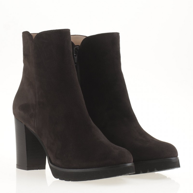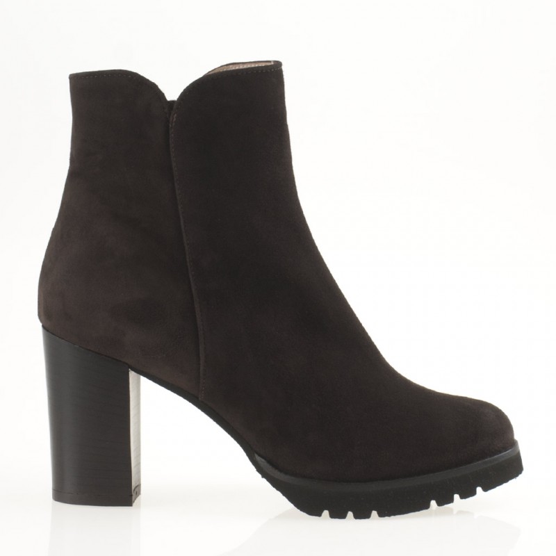 Lo Stivaletto Marrone Camoscio Plateau Tacco Largo รจ il mix perfetto di stile e praticitร . Realizzato in morbido camoscio marrone scuro, presenta un plateau discreto di 2 cm e un tacco robusto e largo alto 9 cm per garantire comfort e stabilitร tutto il giorno. Ideale per completare con un tocco chic i tuoi look autunnali e invernali. Suola in gomma. Made in Italy.