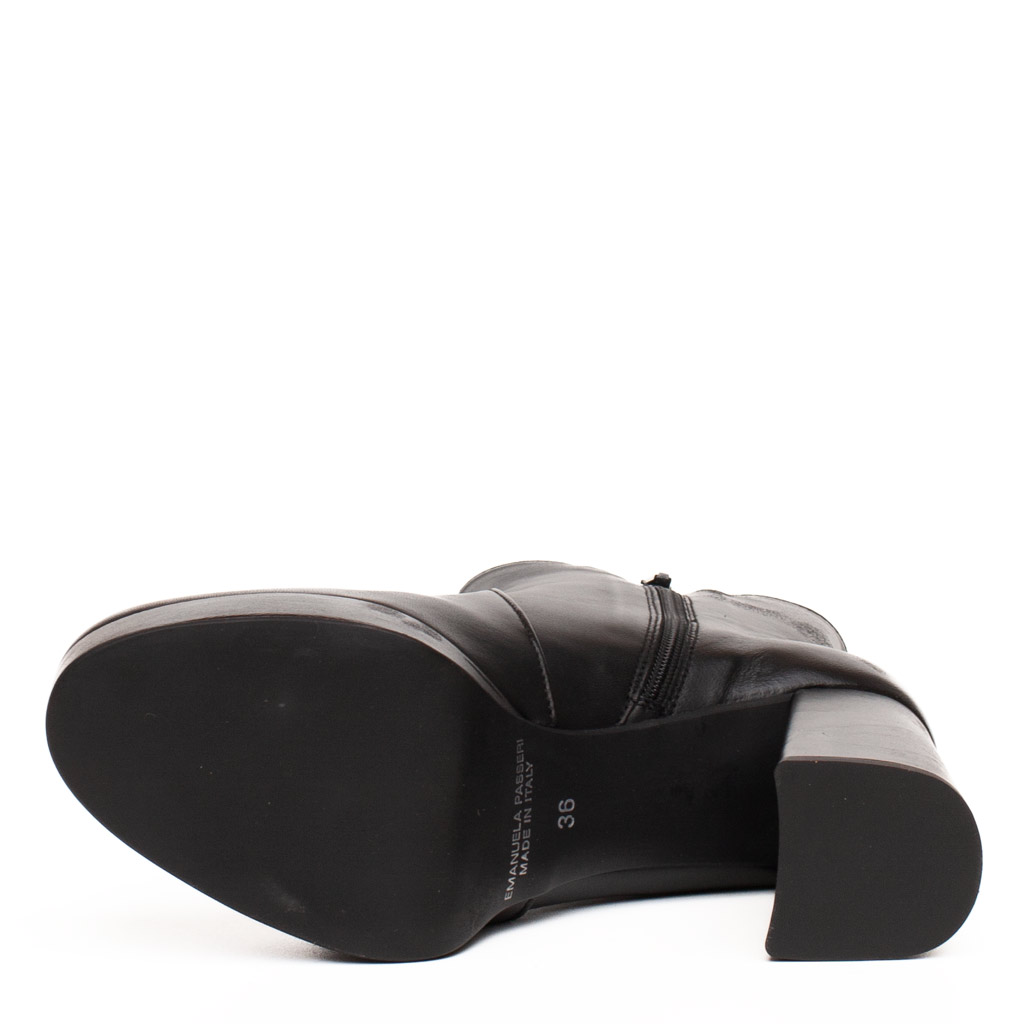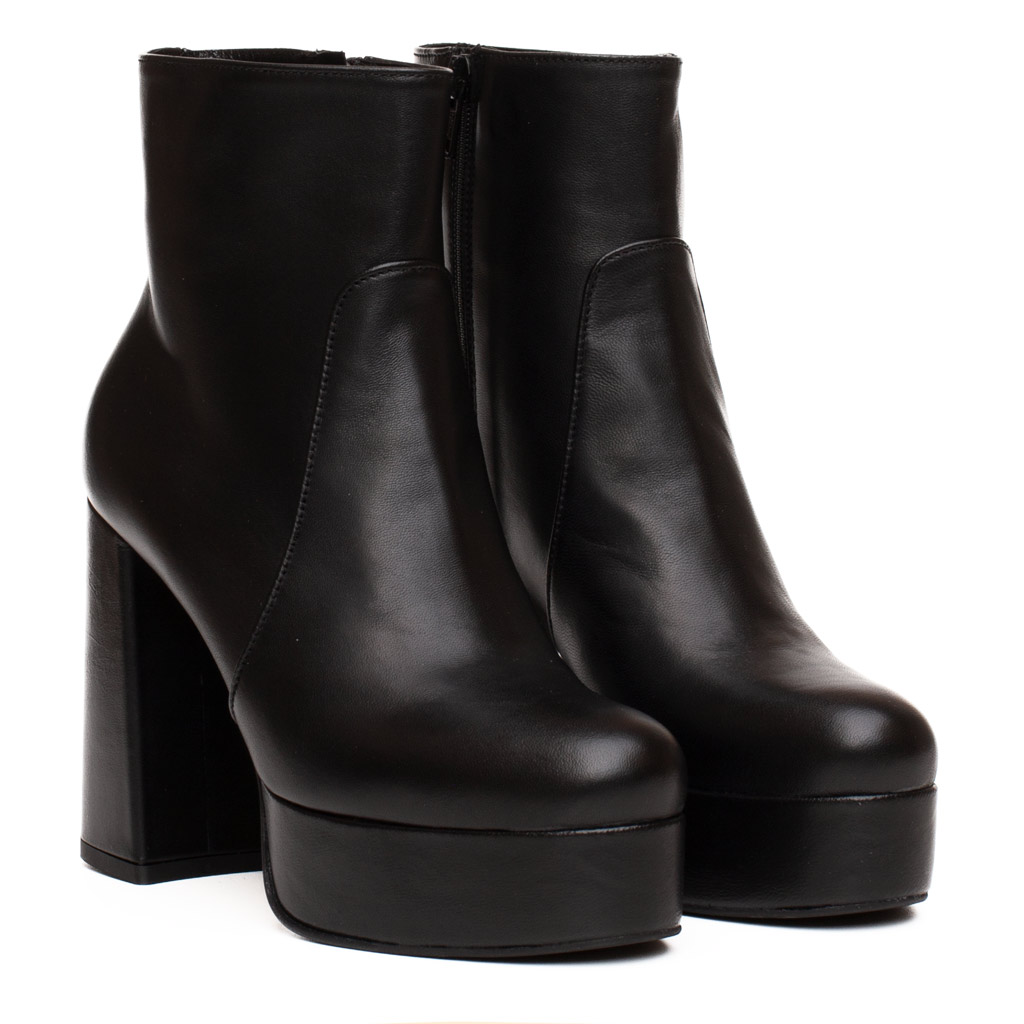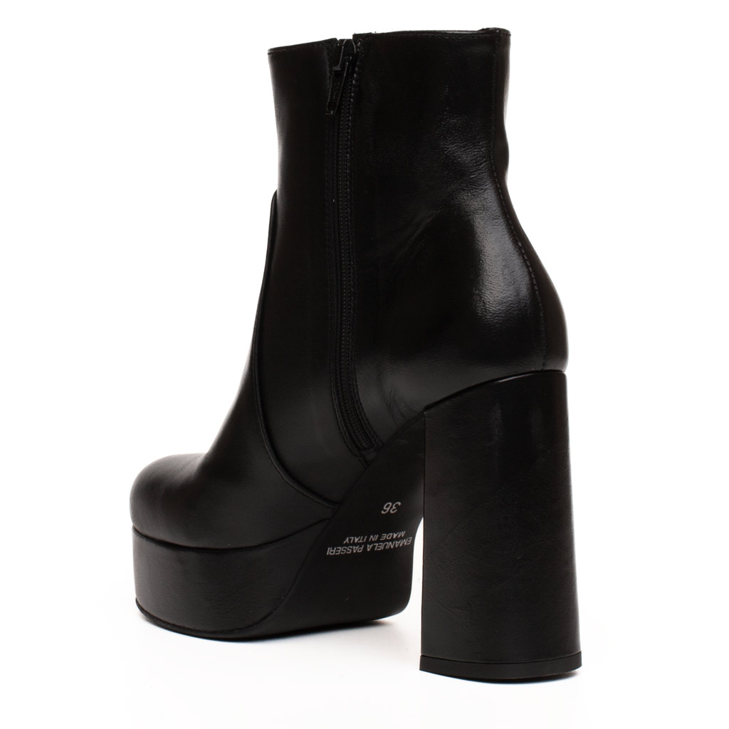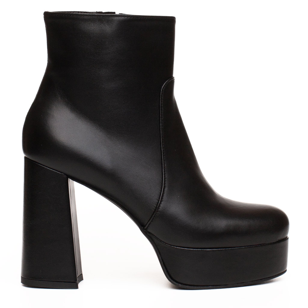 Stivaletto in pelle con cerniera laterale interna. Punta squadrata affusolata. Suola in gomma. Altezza tacco 11 cm, 3 cm di plateau. Fodera in pelle. Made in Italy.