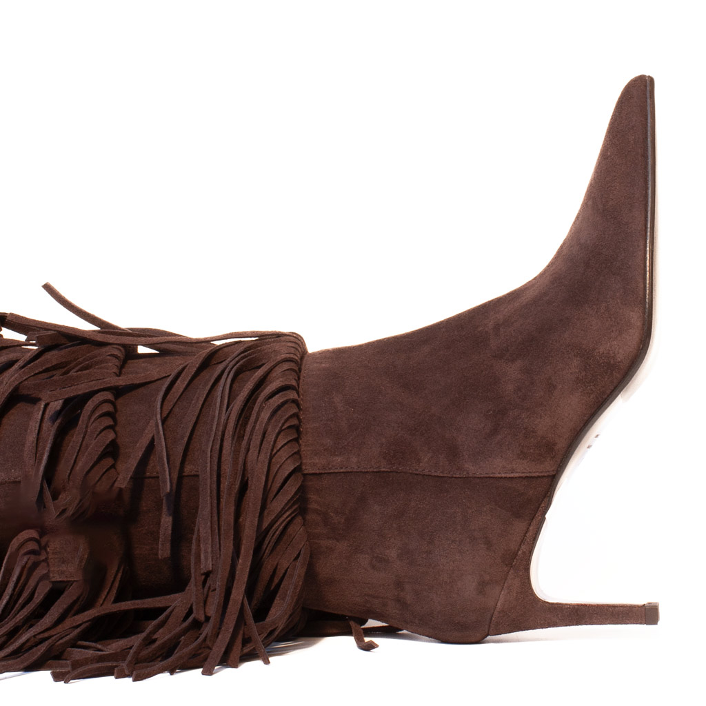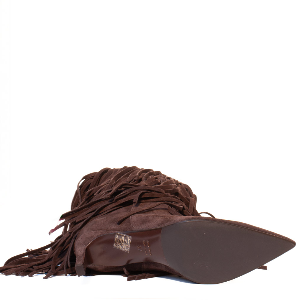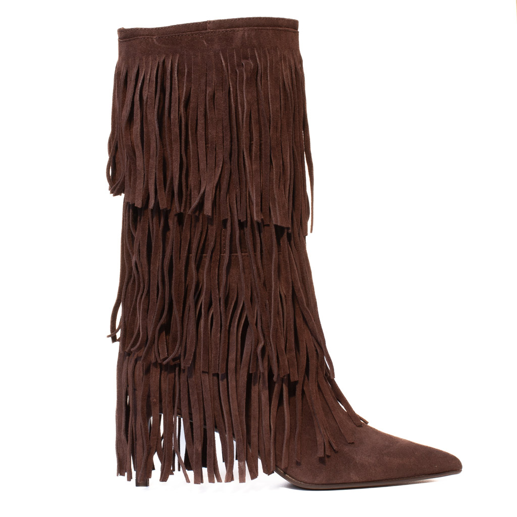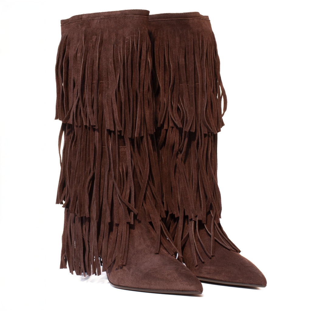 Eleganti stivali in morbido camoscio marrone con tre file di frange decorative. Design bohรฉmien chic con punta affusolata e tacco medio, perfetti per uno stile sofisticato e di tendenza. Made in Italy.
