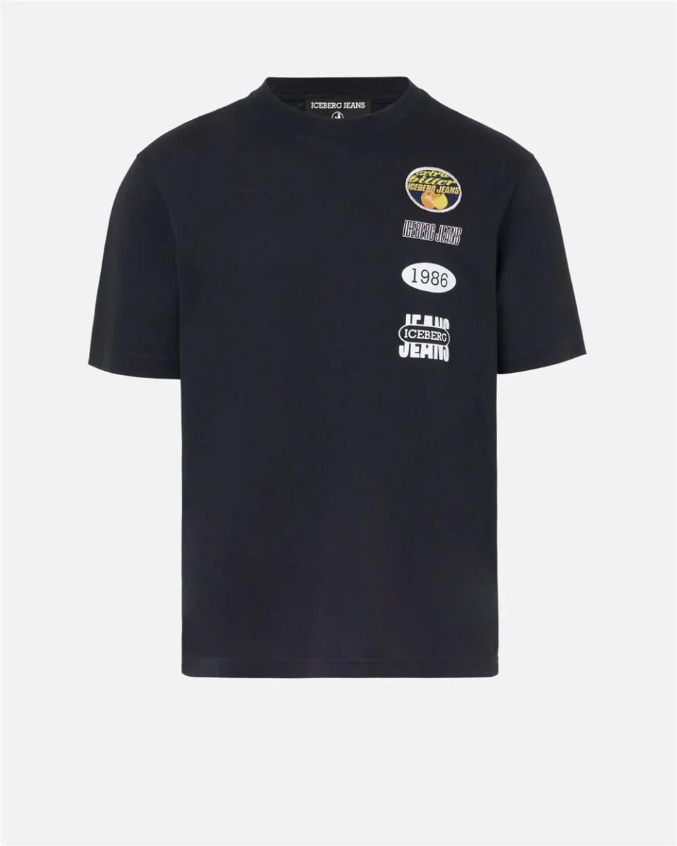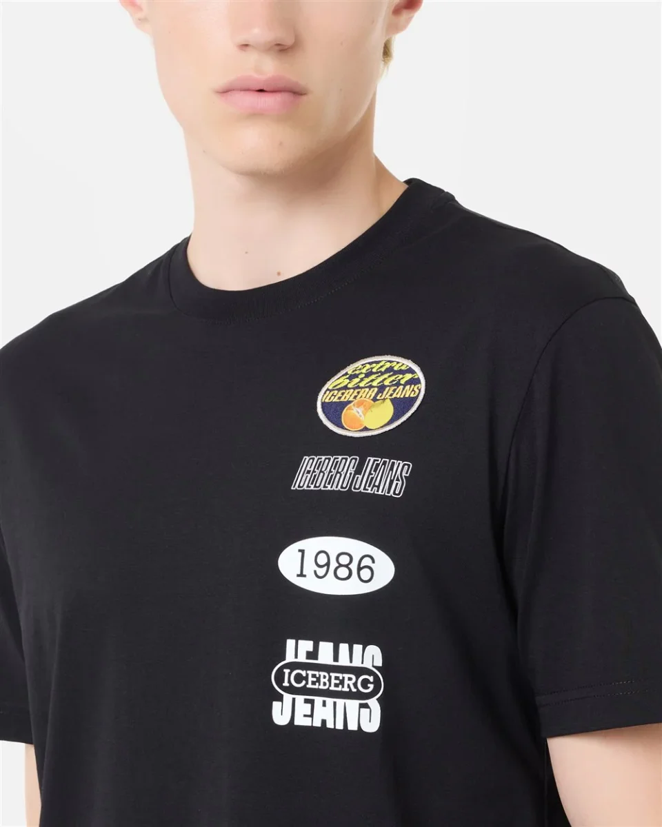 Black cotton jersey t-shirt with a refined fit and understated graphic presence. Features an embroidered “Fruit” patch and logo prints positioned on the left side, while a ribbed crew neck provides clean finishing. The regular fit delivers everyday comfort and versatility, making it an essential layering piece for contemporary casual wardrobes that value measured design details and quality construction.