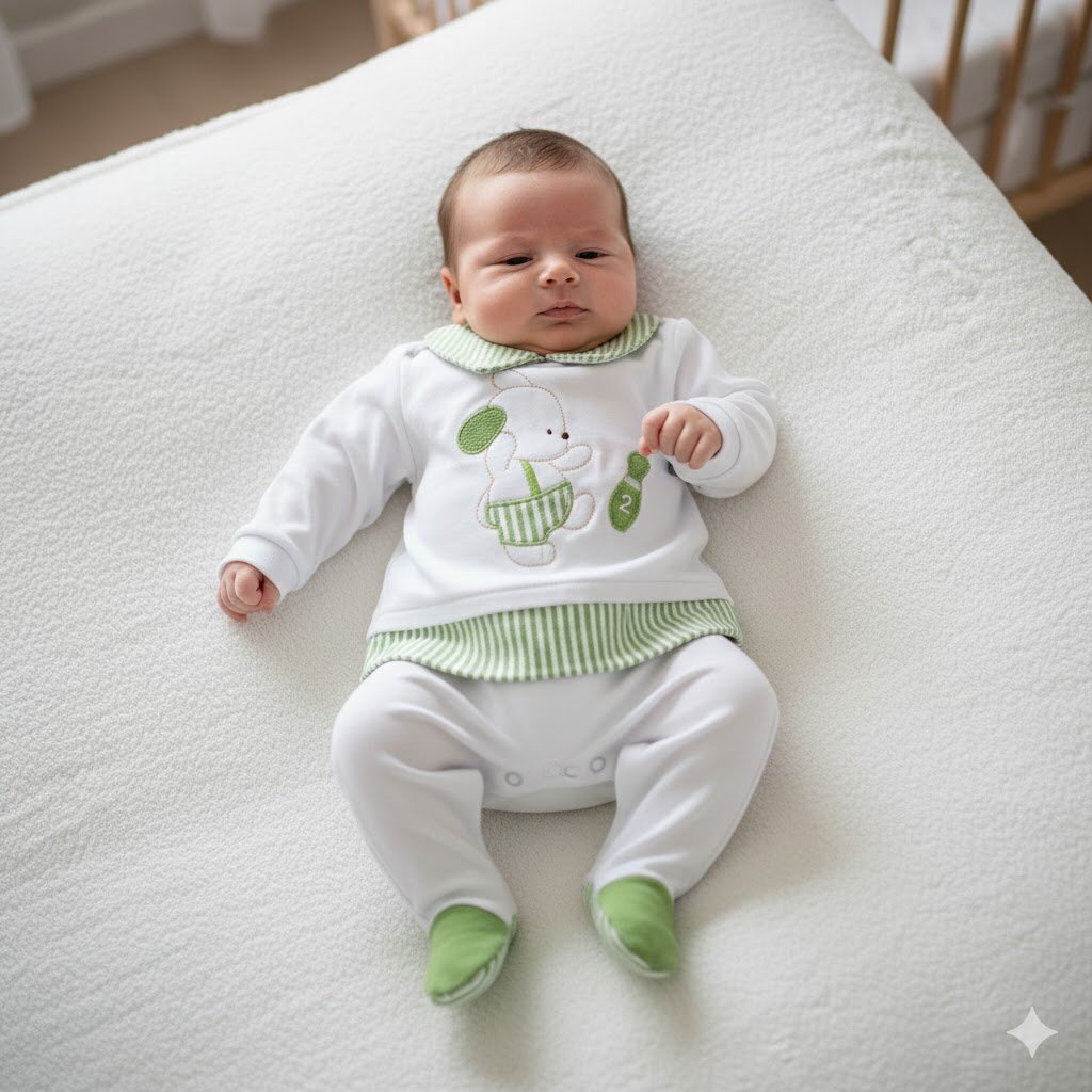 Questo completino nascita per neonato esprime uno stile fresco e giocoso, perfetto per i primi mesi di vita. Il set è caratterizzato da un design pulito che accosta il bianco ottico a dettagli in verde salvia a righe. Ecco i dettagli principali del set: Maglietta a Manica Lunga Colletto Classico: Presenta un colletto a punta con un vivace motivo a righe verticali bianche e verdi. Decorazione Centrale: Sul petto è ricamato un tenero cagnolino stilizzato, impreziosito da dettagli che richiamano il tessuto a righe (come le orecchie e la salopette) e accompagnato da un piccolo birillo con il numero “2”.…