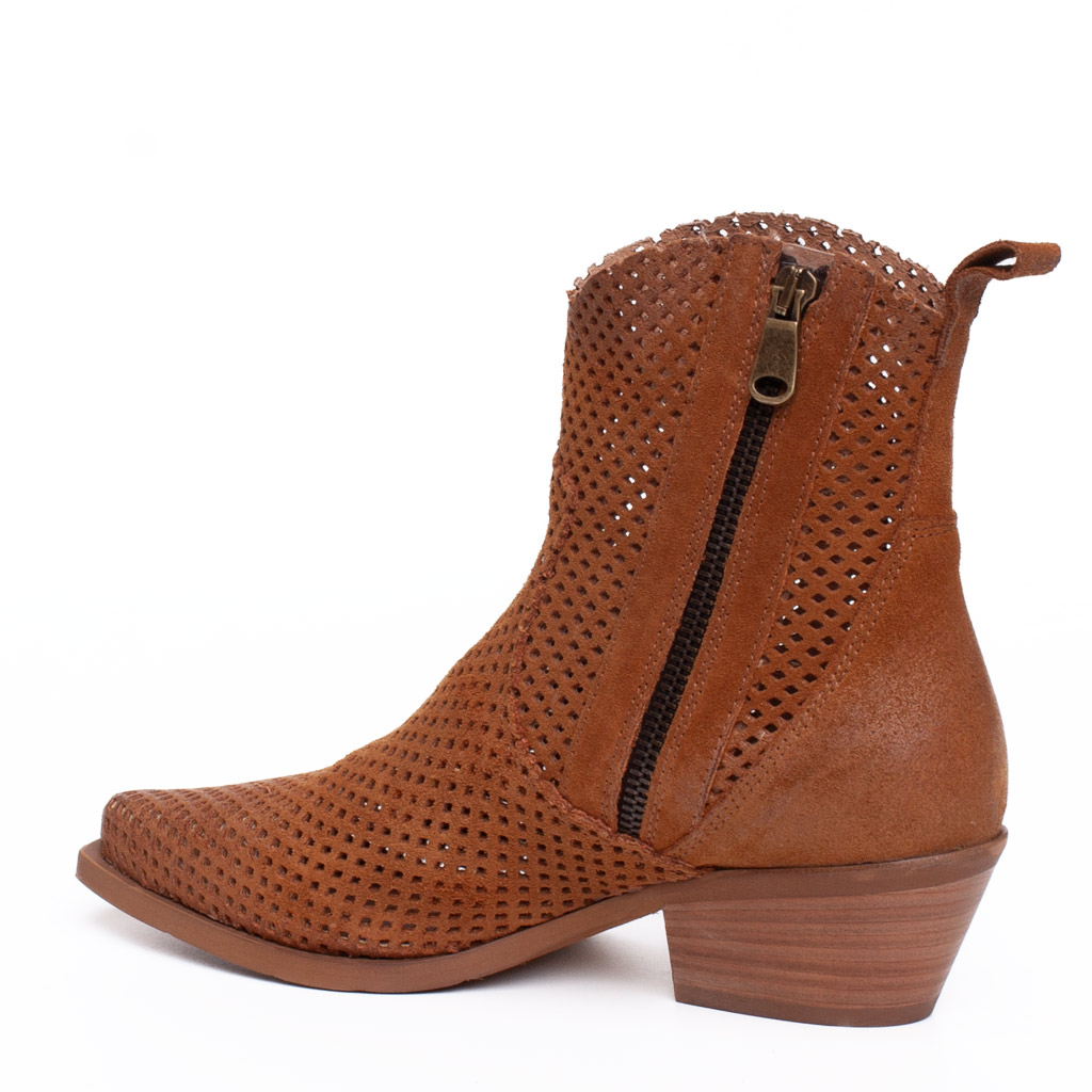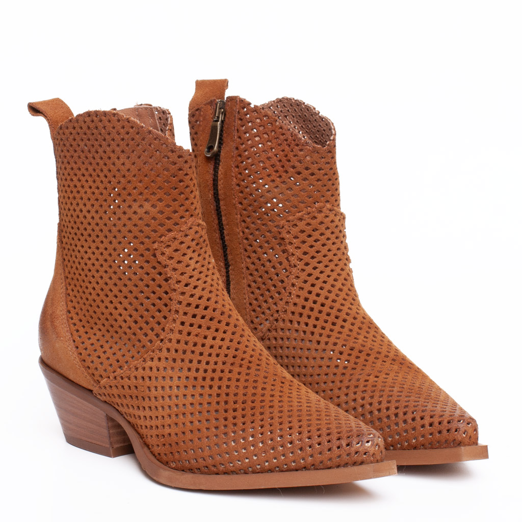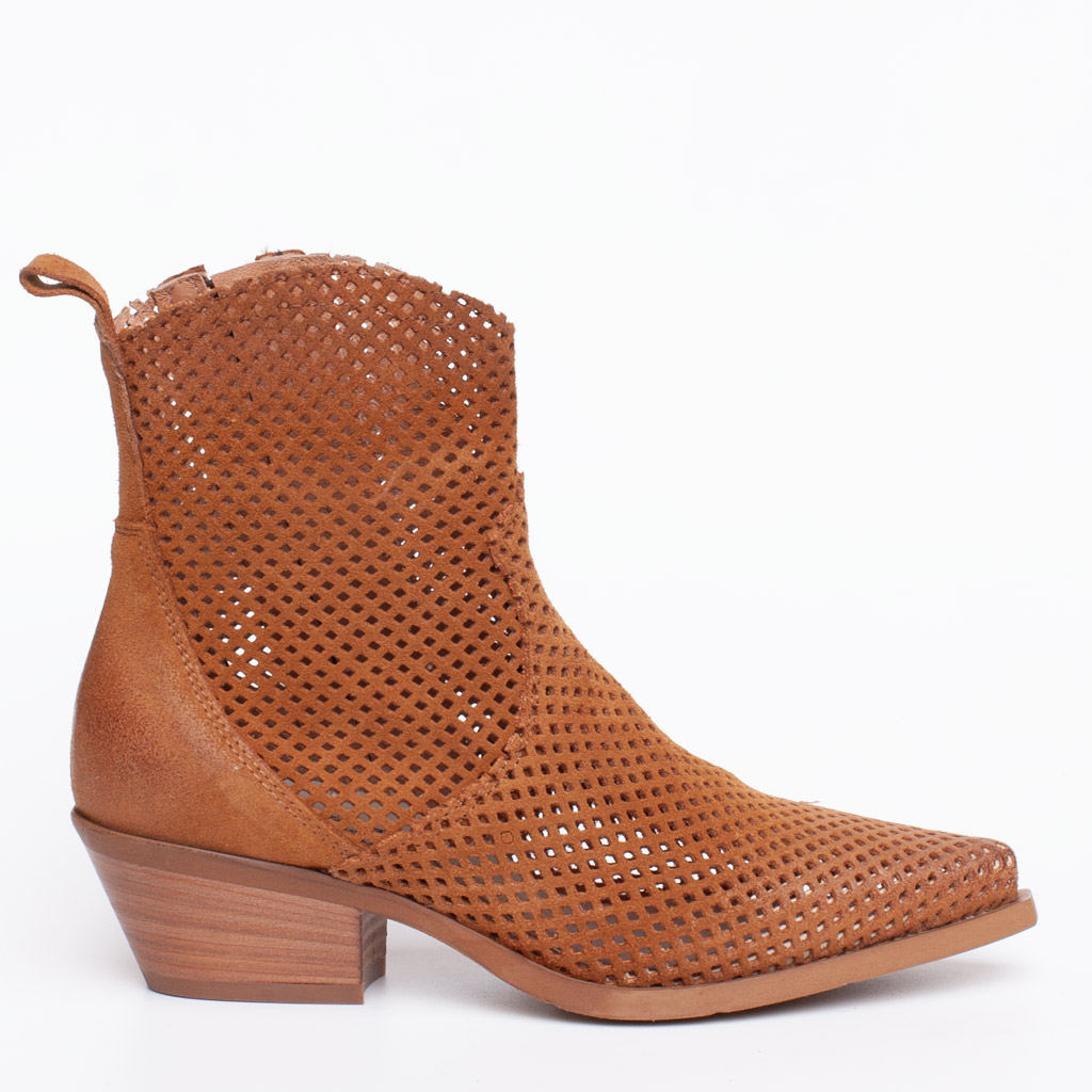 Stivaletto texano in camoscio traforato con la punta affusolata e tacco alto 5 cm รจ l’abbinamento perfetto con una minigonna in pelle o un paio di jeans sfrangiati. Realizzato artigianalmente in Italia.