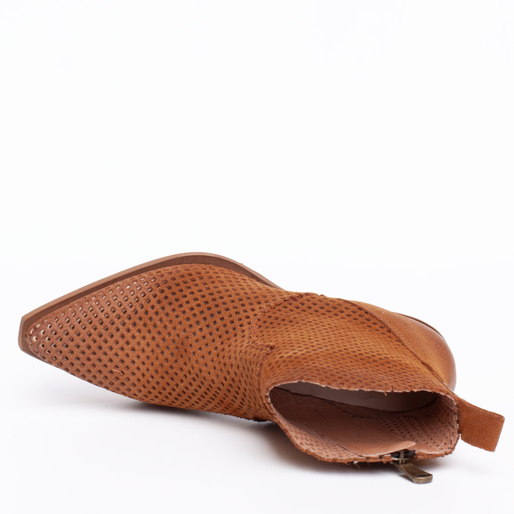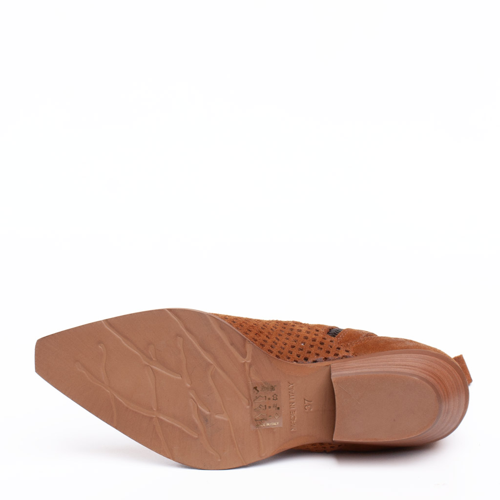 Stivaletto a punta in camoscio traforato. Cerniera laterale. Fodera in pelle. Suola in gomma. Altezza tacco 5 cm. Made in Italy.