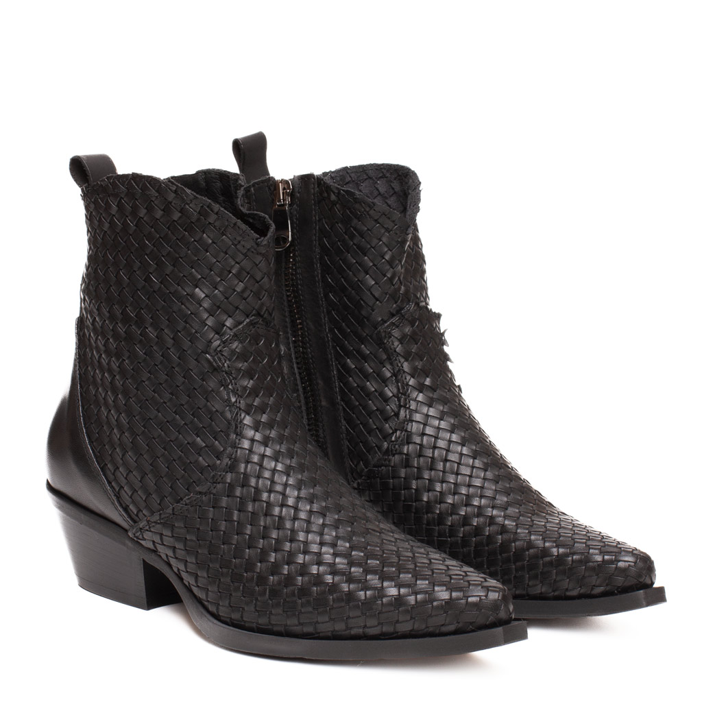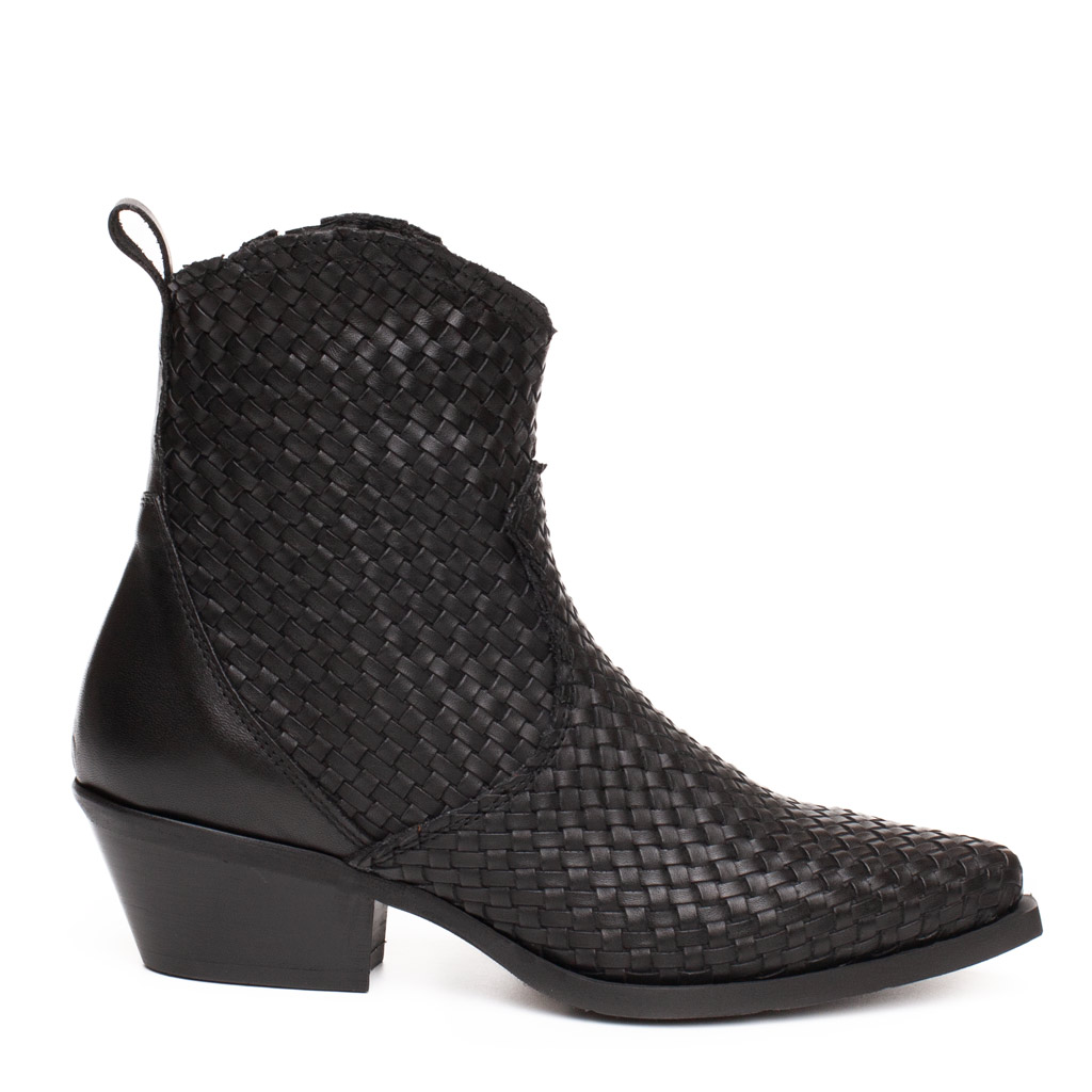 Stivaletto texano in pelle intrecciata con la punta affusolata e tacco alto 5 cm รจ l’abbinamento perfetto con una minigonna in pelle o un paio di jeans sfrangiati. Realizzato artigianalmente in Italia.