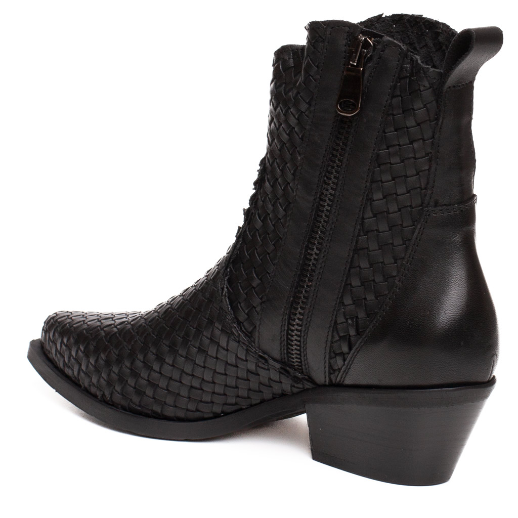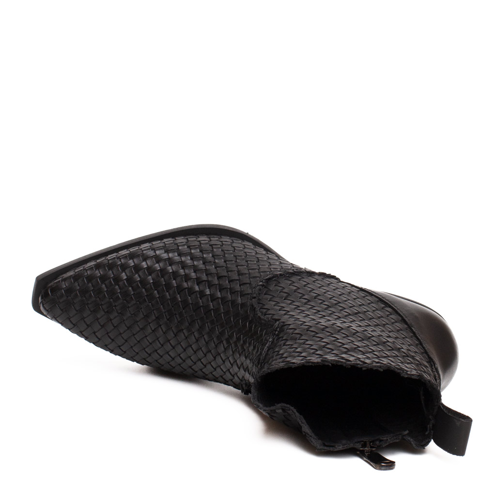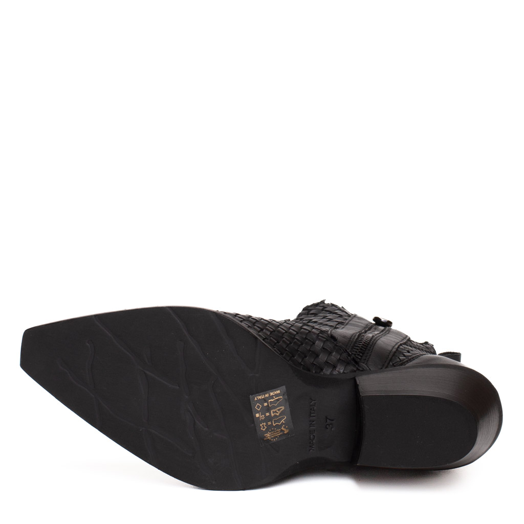 Stivaletto a punta in pelle intrecciata. Cerniera laterale. Fodera in pelle. Suola in gomma. Altezza tacco 5 cm. Made in Italy.