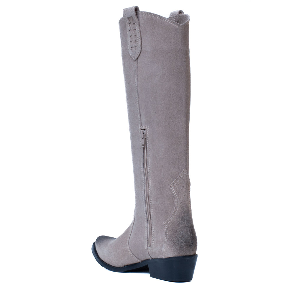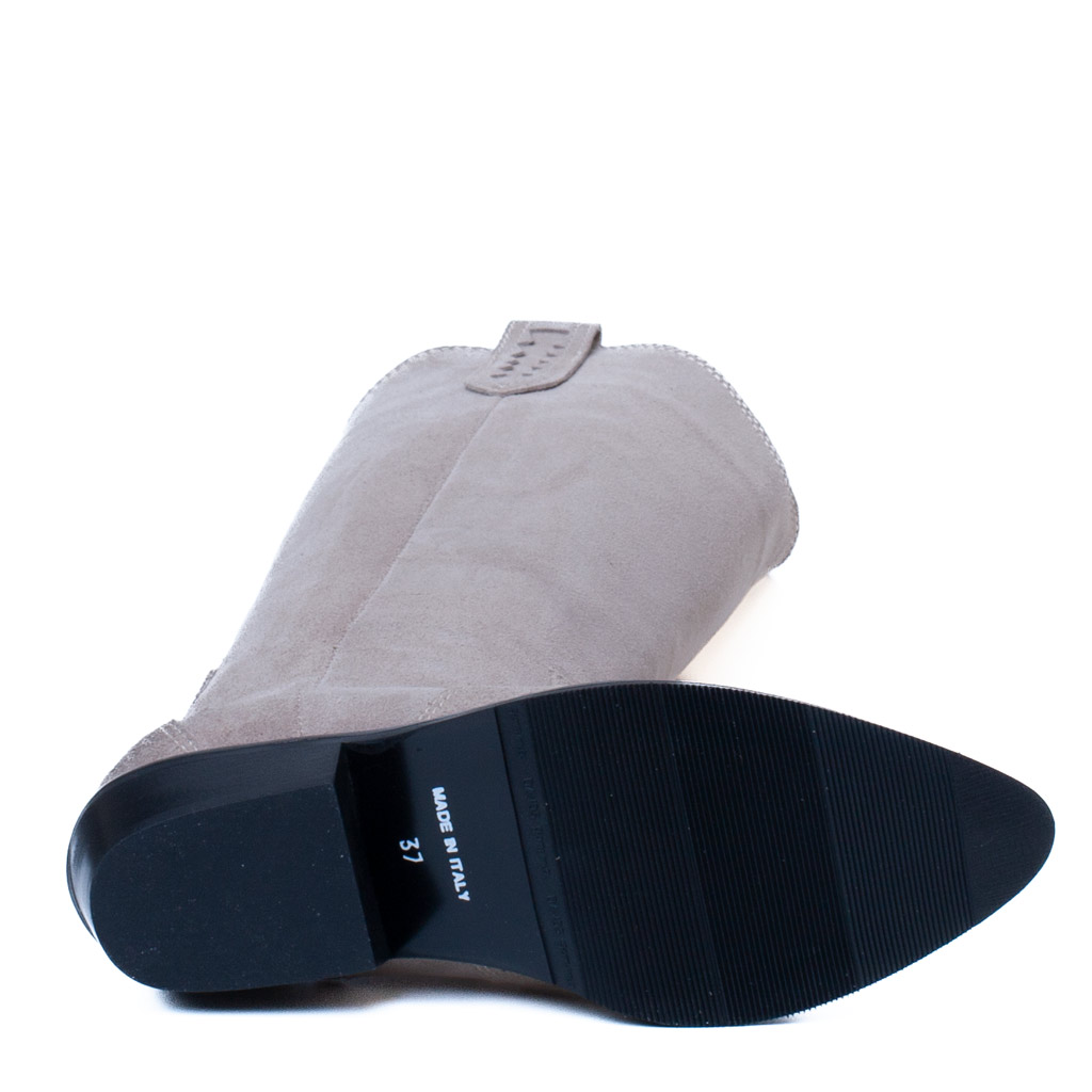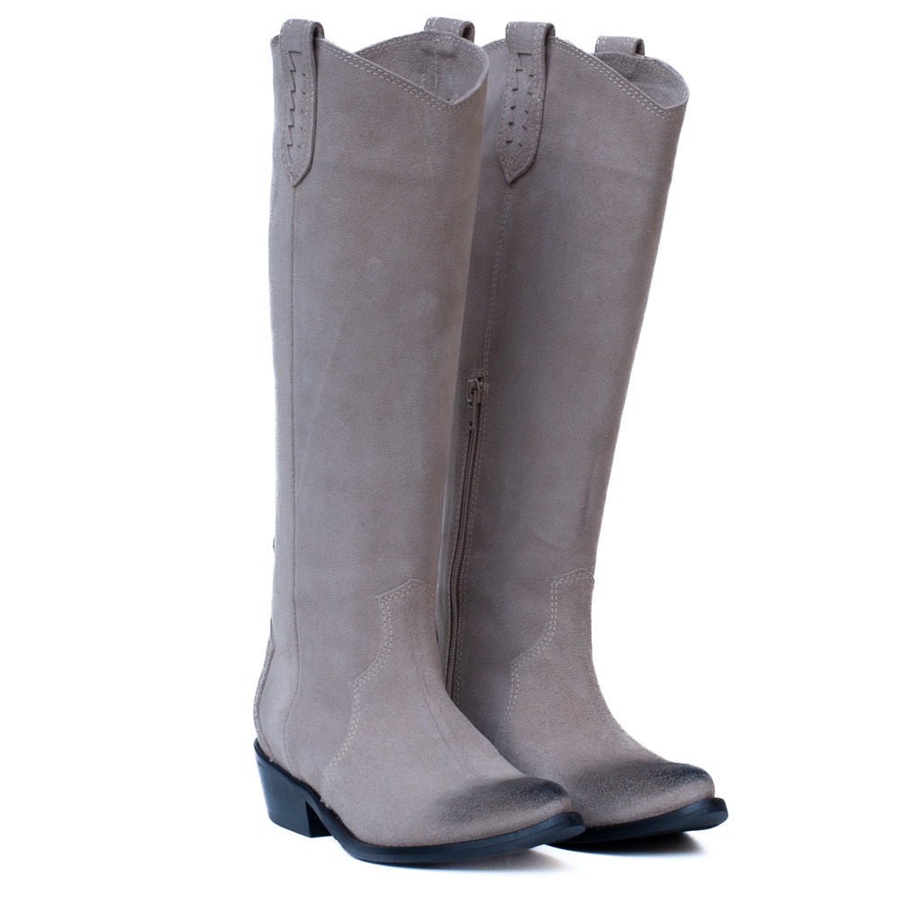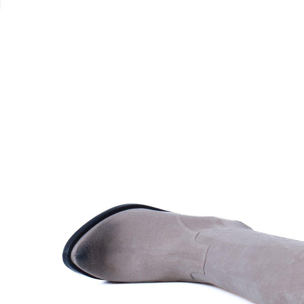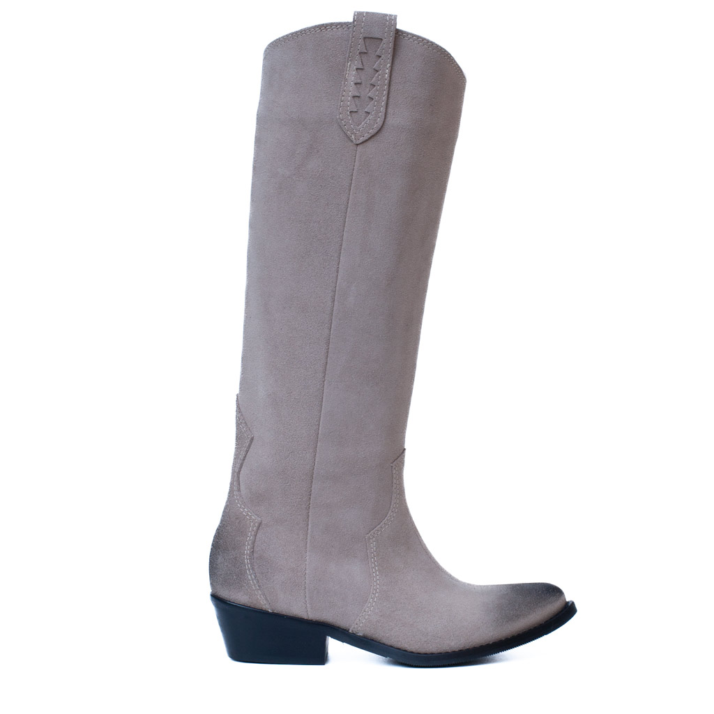 Stivale texano in camoscio con cerniera laterale interna. Altezza tacco 4.5 cm. Fodera in pelle. Suola in cuoio e gomma. Made in Italy.
