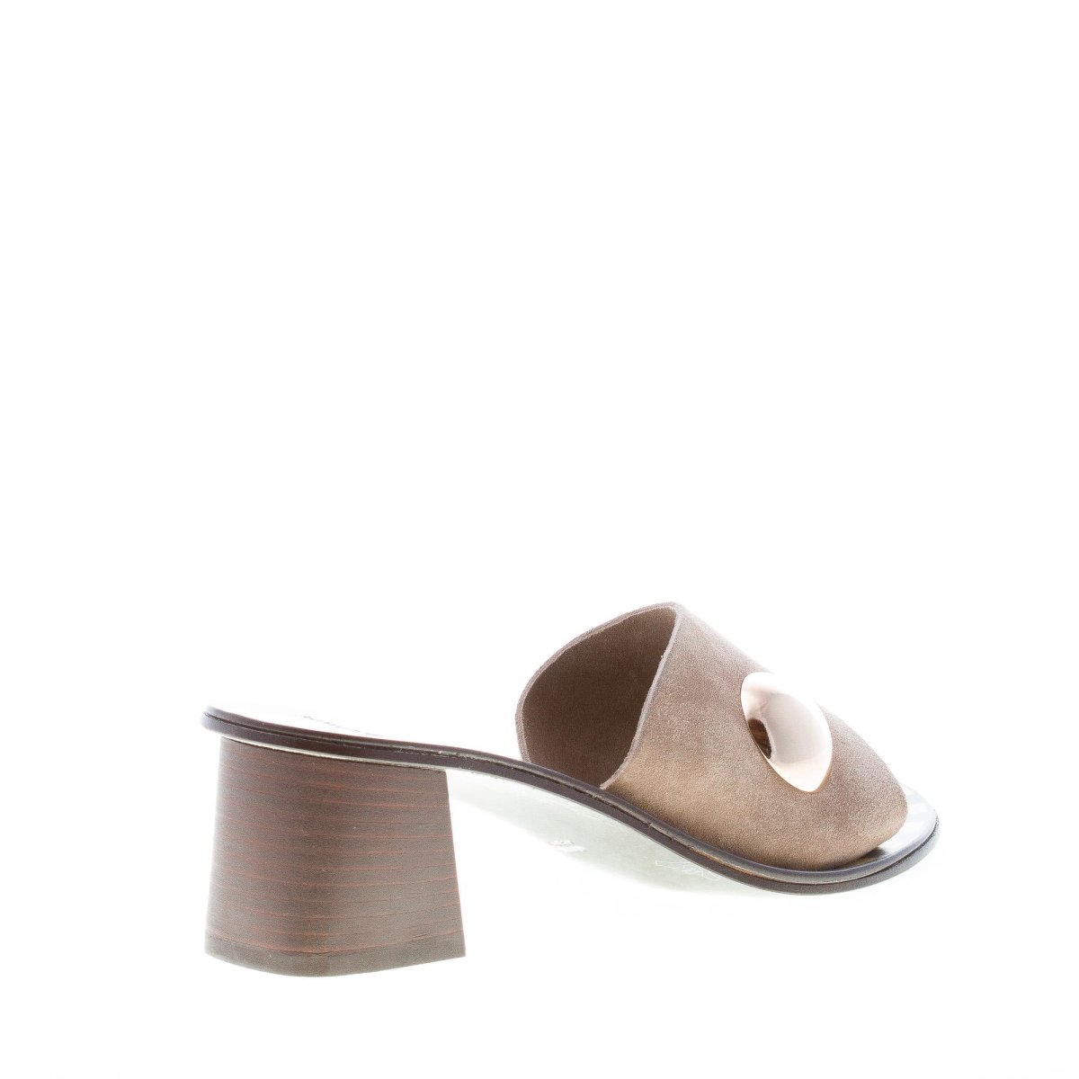 Sandalo slide con larga fascia in camoscio tortora decorata con un bottone dorato. Tacco largo di 6 cm. Suola in cuoio