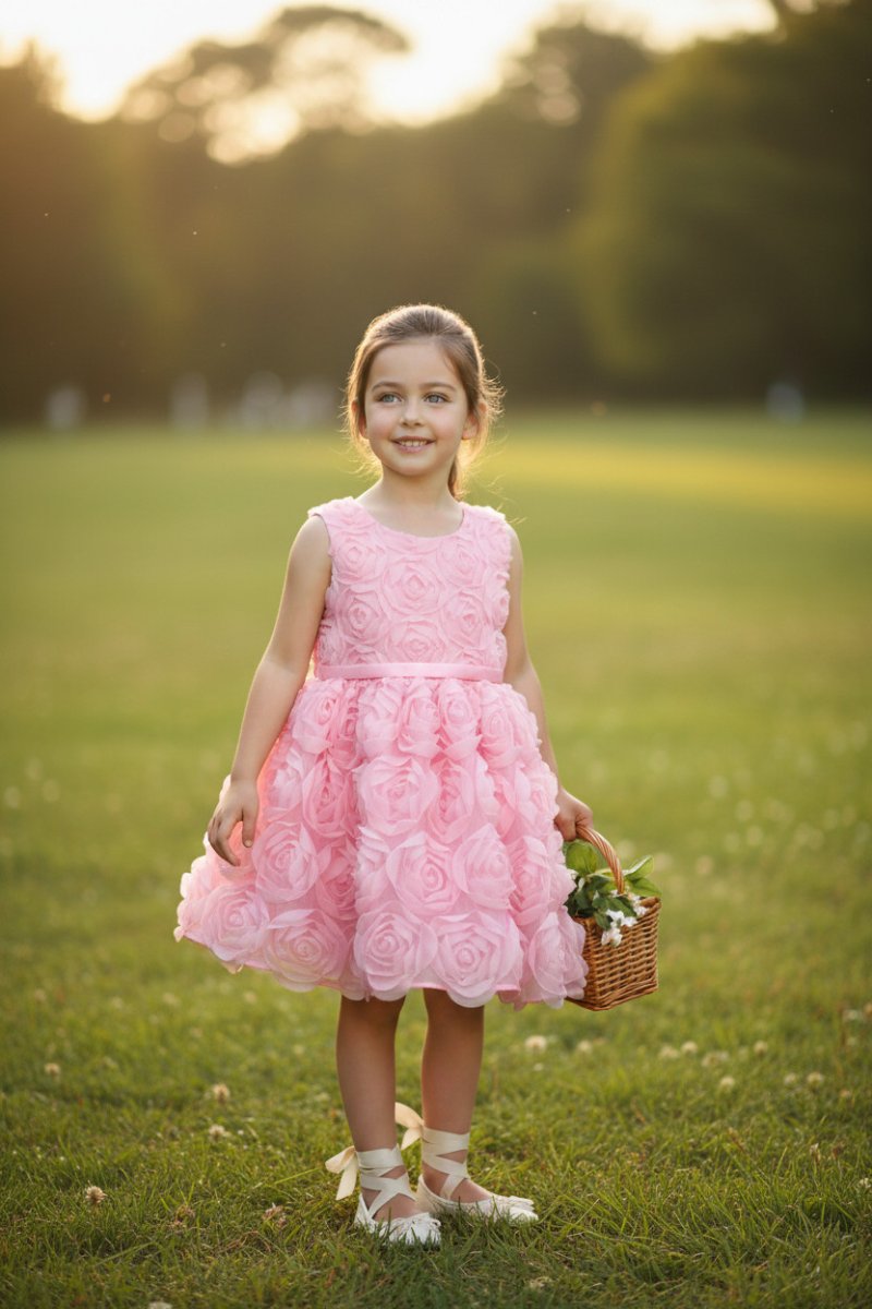 Si tratta di un abito rosa cipria, delicato e romantico, perfetto per una cerimonia o unโoccasione speciale. Lโintera superficie รจ impreziosita da applicazioni tridimensionali a forma di rosa, che creano un effetto floreale ricco e scenografico, ma allo stesso tempo dolce e armonioso.