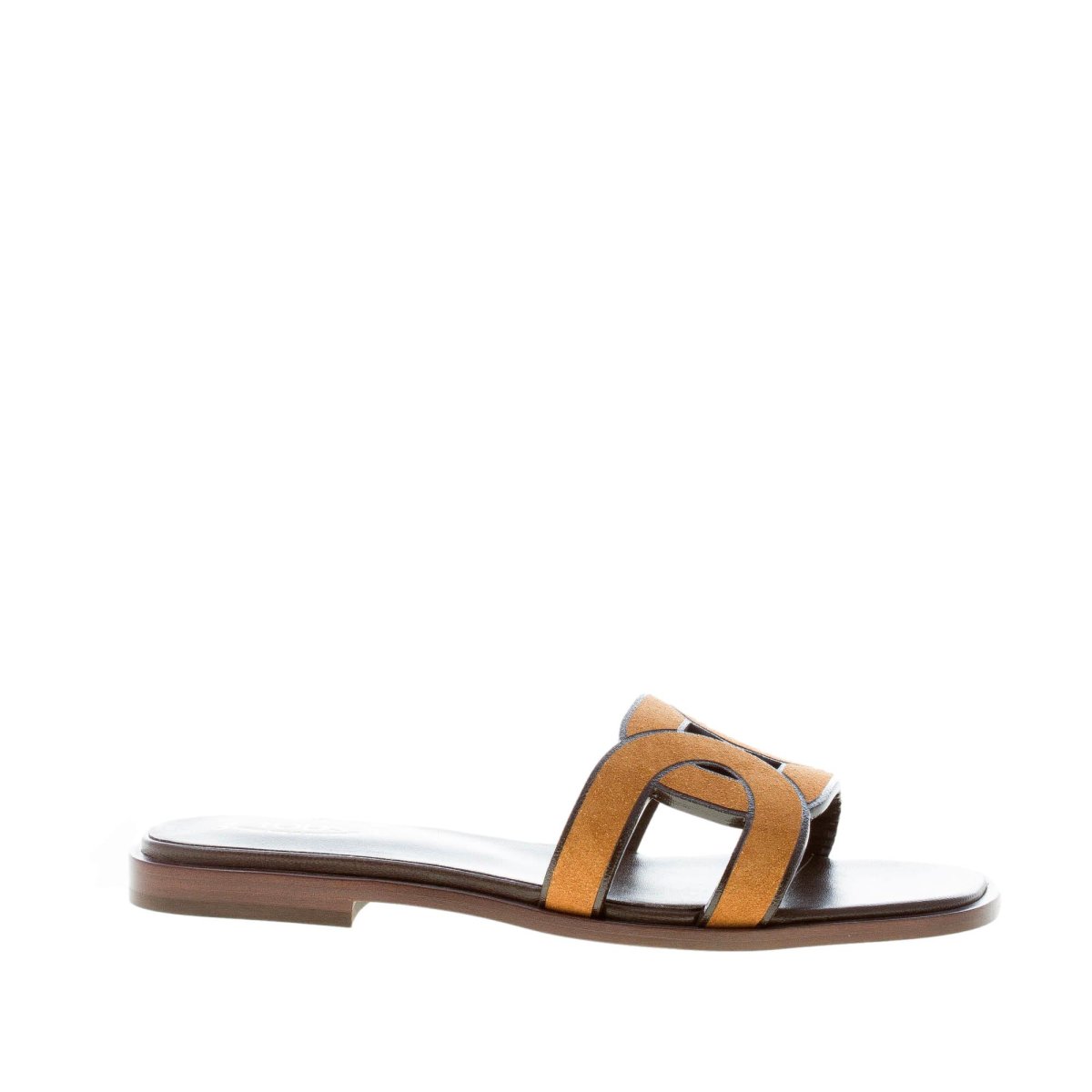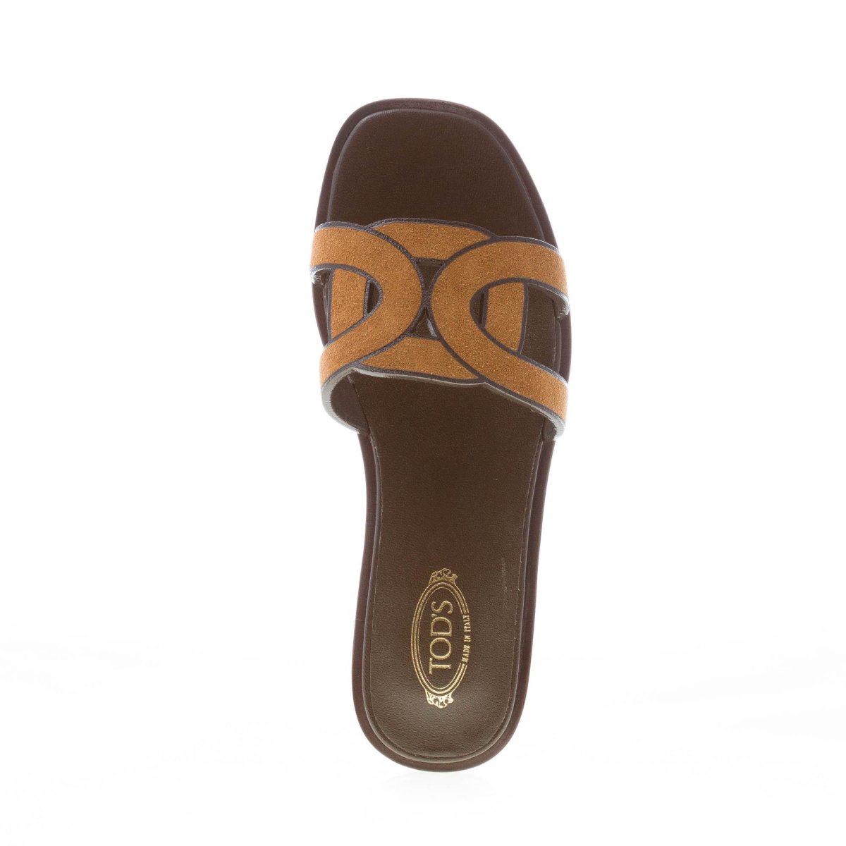 TOD’S donna sandalo ciabatta in camoscio CUOIO con fascia intrecciata a catena. Suola cuoio