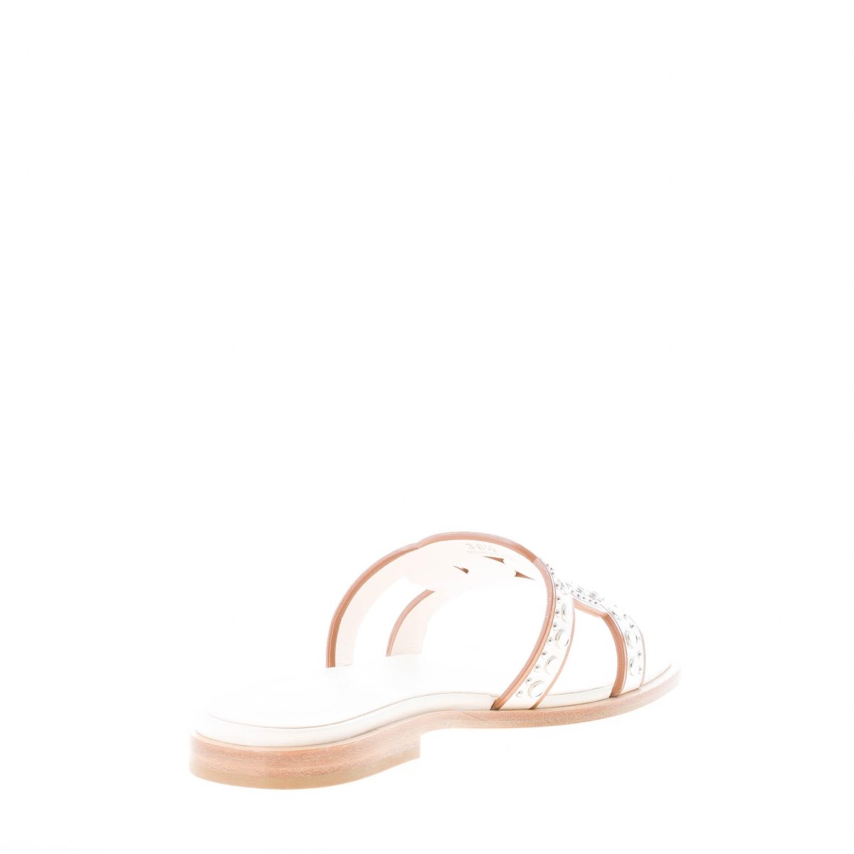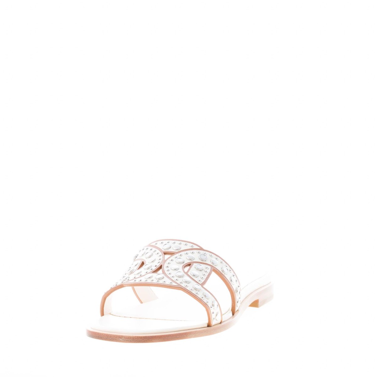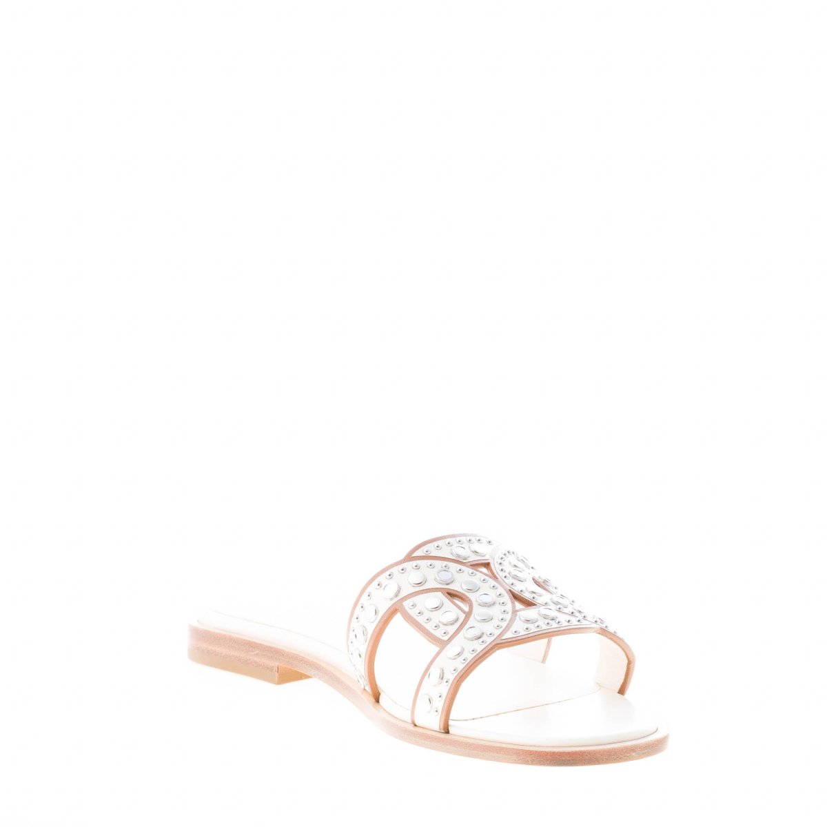 Mousse white fine goat leather flat slide sandal with a front large interwoven band reproducing the iconic chain accessory. The front band is embellished with metal studs. Leather sole. Heel 1,5 cm