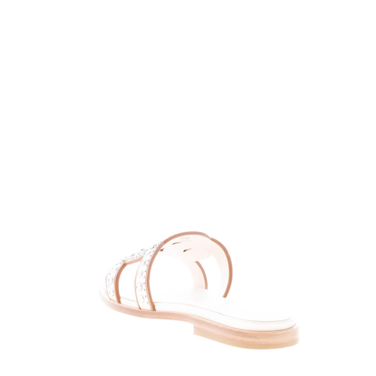 Sandalo ciabatta basso realizzato in raffinata pelle di capra colore mousse bianco con larga fascia intrecciata sul piede per riprodurre l’iconico accessorio catena. La fascia รจ decorata con borchiette in metallo. Suola in cuoio. Tacco 1,5 cm