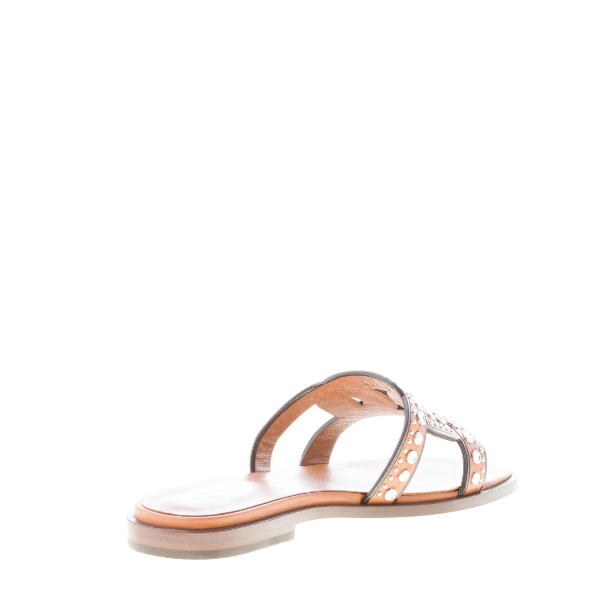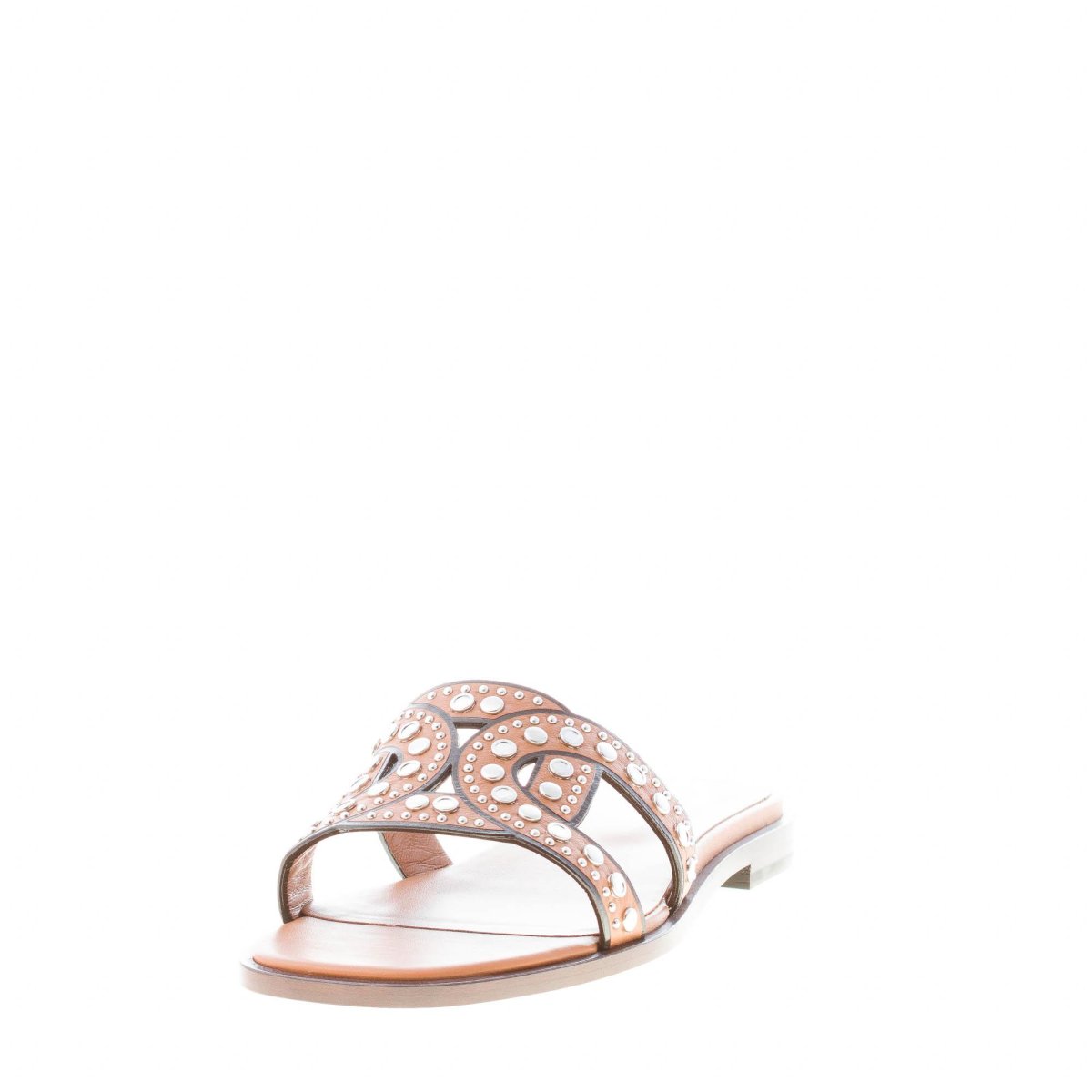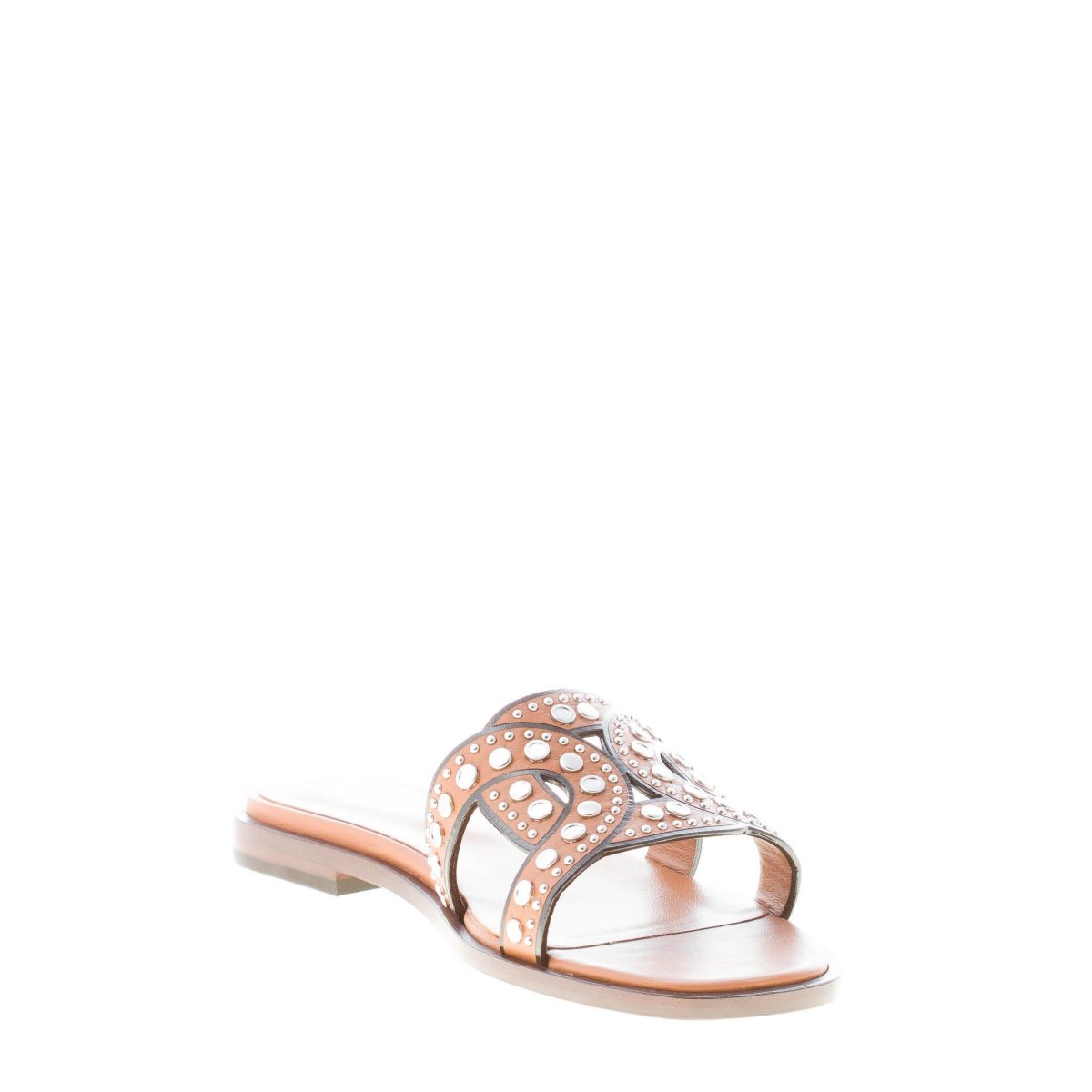 Brown fine goat leather flat slide sandal with a front large interwoven band reproducing the iconic chain accessory. The front band is embellished with metal studs. Leather sole. Heel 1,5 cm