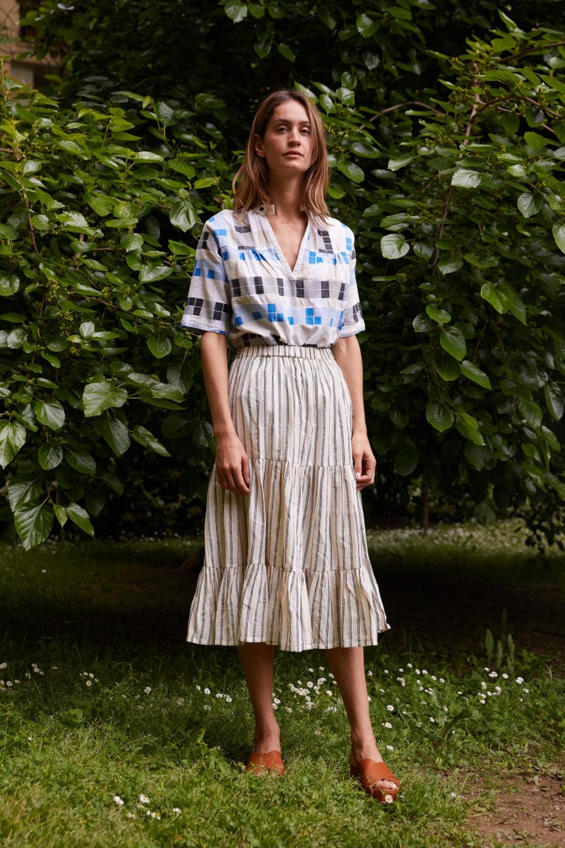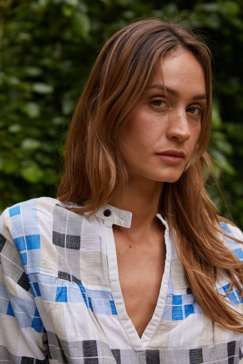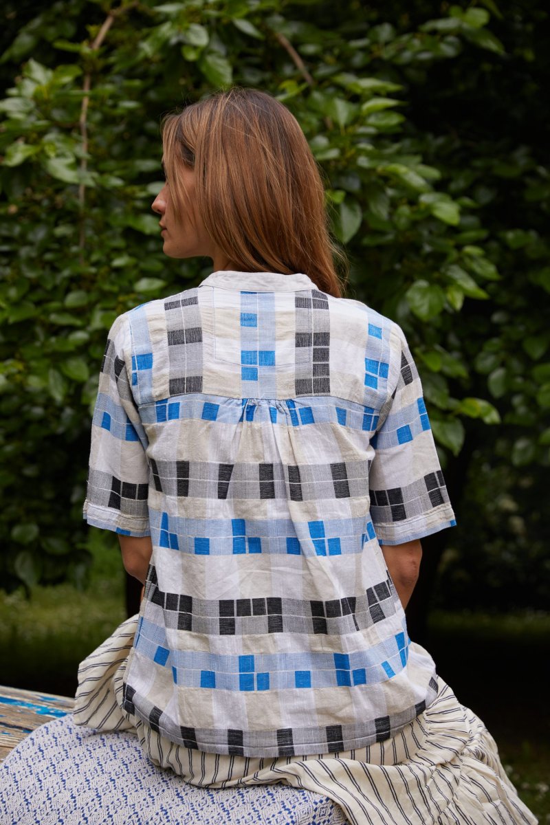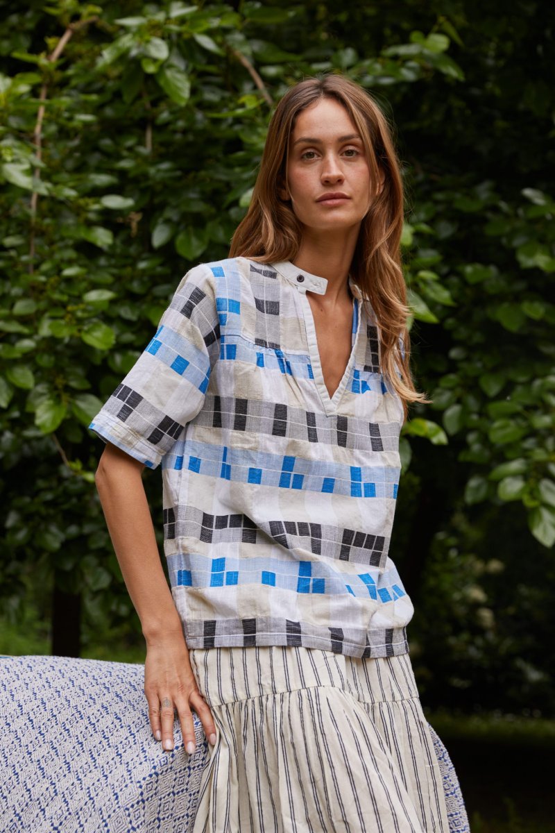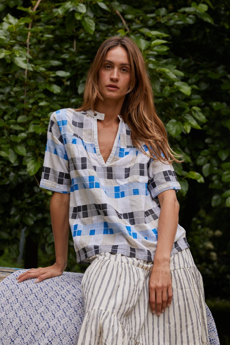 Questo top di Ace&Jig รจ realizzato in un bellissimo cotone tessuto a mano a quadretti bluette, neri ed ecru. Il modello ha una vestibilitร ampia, le maniche corte, lo scollo a V e chiusura a due bottoni, con carrรฉ davanti e dietro. Indossalo su una gonna a righe per un mix & match perfetto. 100% cotone Scollo a V con chiusura a 2 bottoni Carrรฉ fronte e retro Maniche corte Vestibilitร comoda: la modella รจ alta 180 cm e indossa la taglia XS