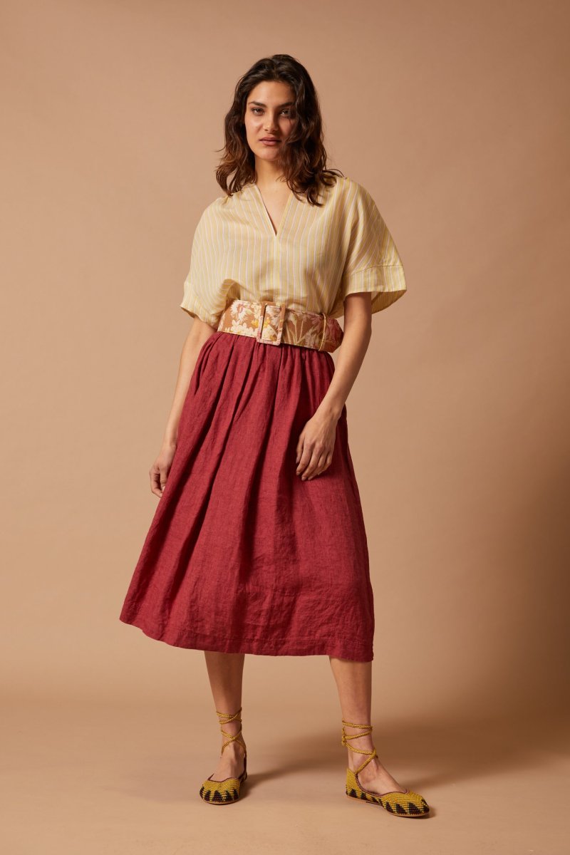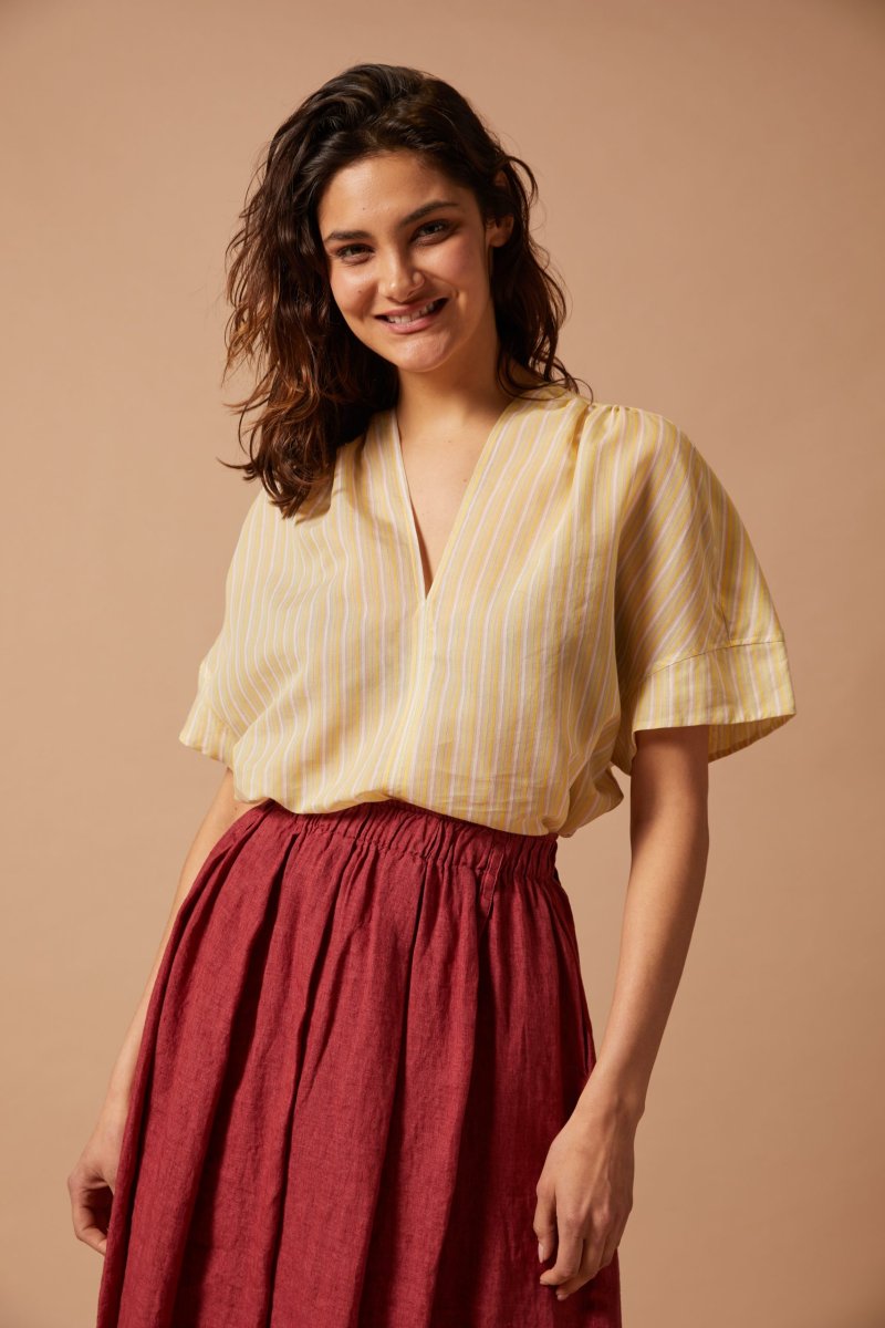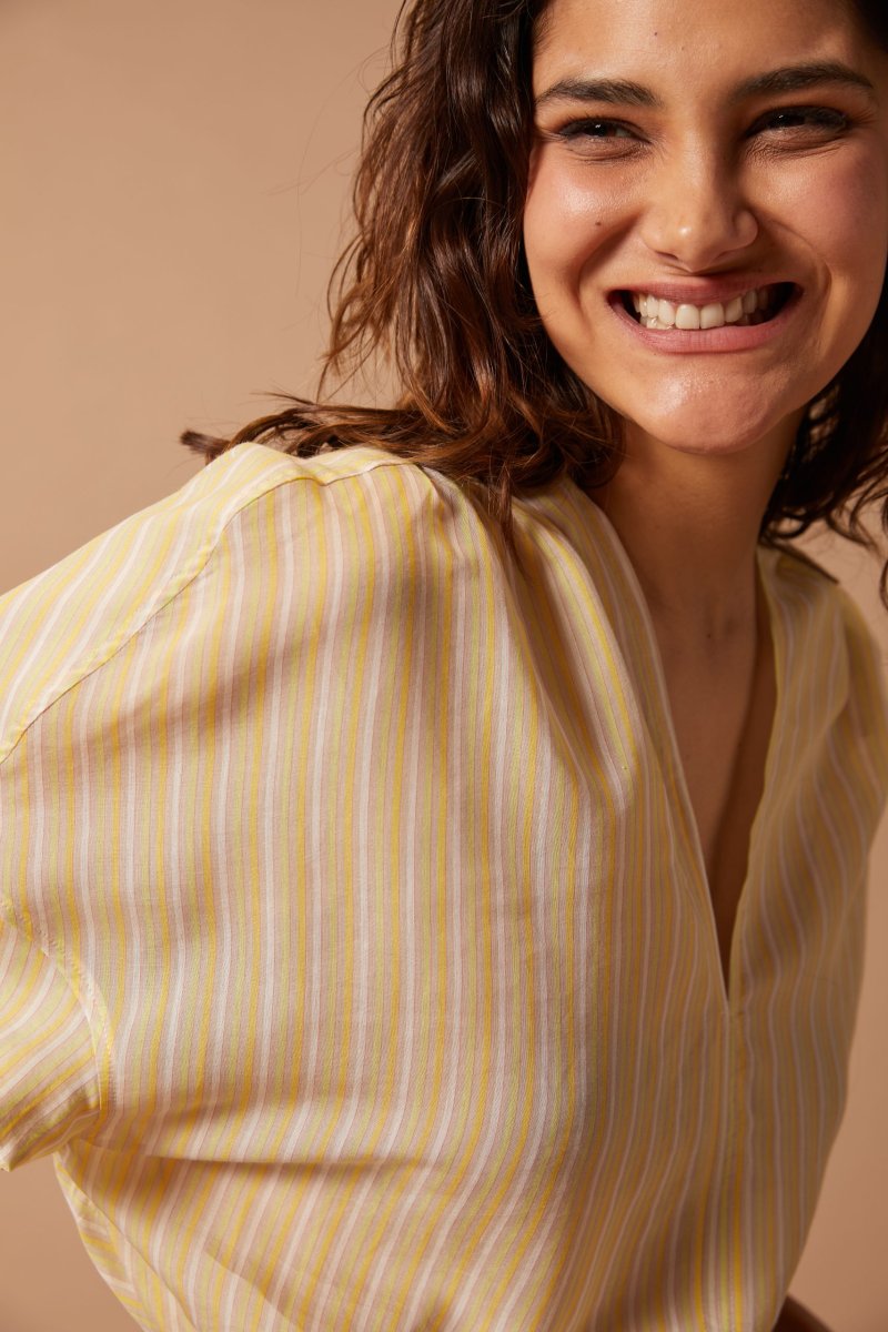 Top Marilù di Carla Saibene con scollo a V, maniche corte a kimono, linea dritta e ampia e con piccole arricciature ai lati dello scollo e sul retro.. La versione in morbida mussola di cotone a righine gialle e verdi abbinata ad un pantalone o una gonna colorata creano un look fresco e divertente. Vedi altre varianti 100% cotone Made in Italy Vestibilità regolare, Caterina è alta 179 cm e indossa una M Esiste in altri tessuti e varianti