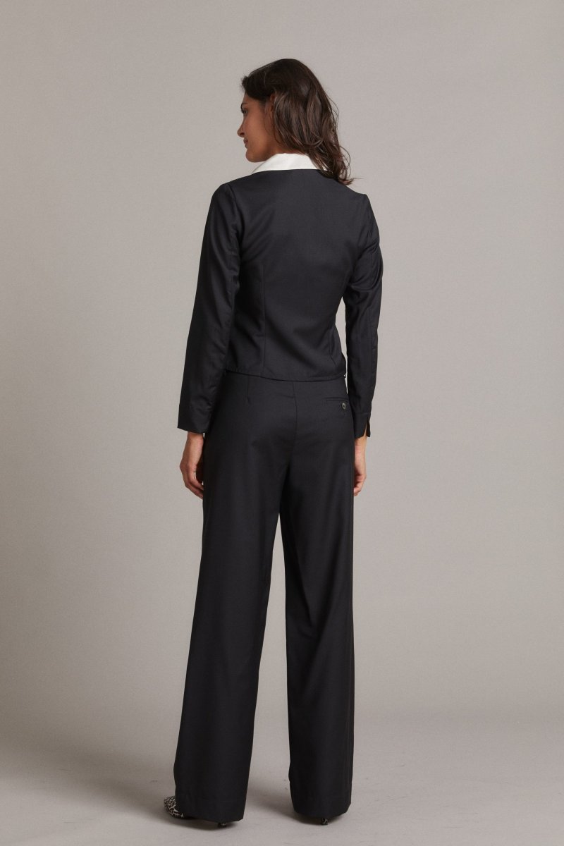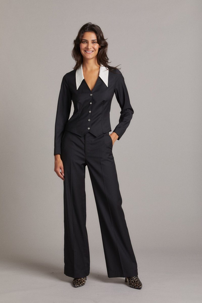 Top Nicole di Carla Saibene, in fresco lana nero jacquarddalla linea leggermente svasata e molto donante. Maniche lunghe con spacchetto, scollo a V e orlo con piccole punte che ricordano un gilet maschile. Il colletto in seta รจ staccabile e reversibile. Questo modello รจ molto versatile, perfetto sia come top che come giacchina corta. Vedi altre varianti 100% lana Colletto in seta reversibile e staccabile Made in Italy Vestibilitร regolare: la modella indossa la taglia 40