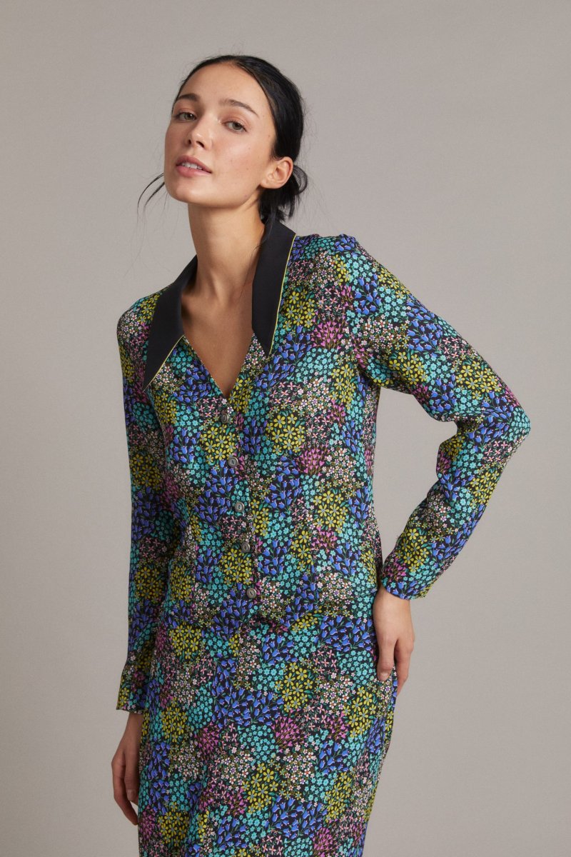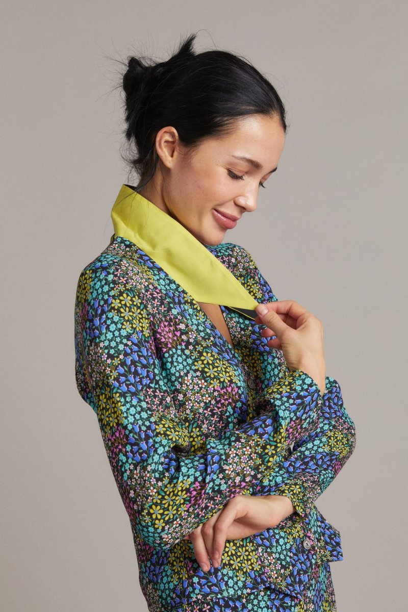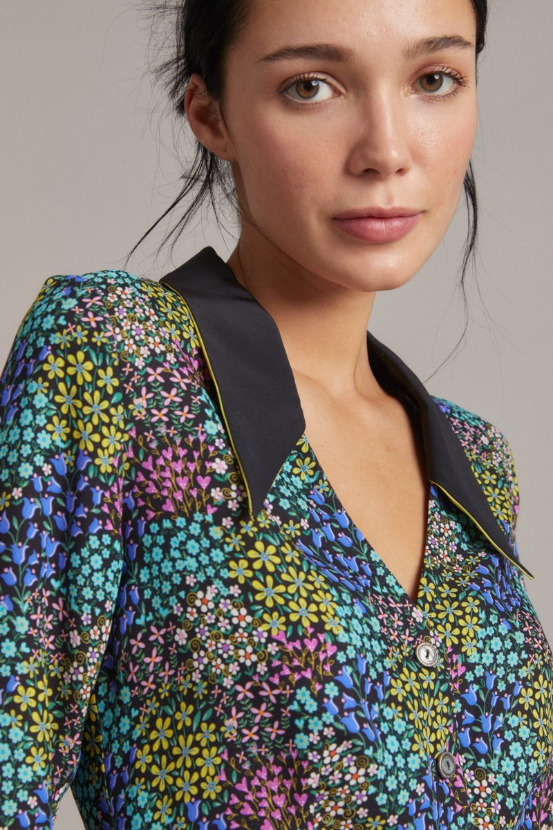 Top Nicole di Carla Saibene, in seta stampata a fiorellini multicolor dalla linea leggermente svasata e molto donante. Maniche lunghe con spacchetto, scollo a V e orlo con piccole punte che ricordano un gilet maschile. Il colletto รจ staccabile e reversibile. Questo modello รจ molto versatile, perfetto sia come top che come giacchina corta. Vedi altre varianti 100% seta Colletto reversibile e staccabile Made in Italy Vestibilitร regolare: la modella indossa la taglia 40