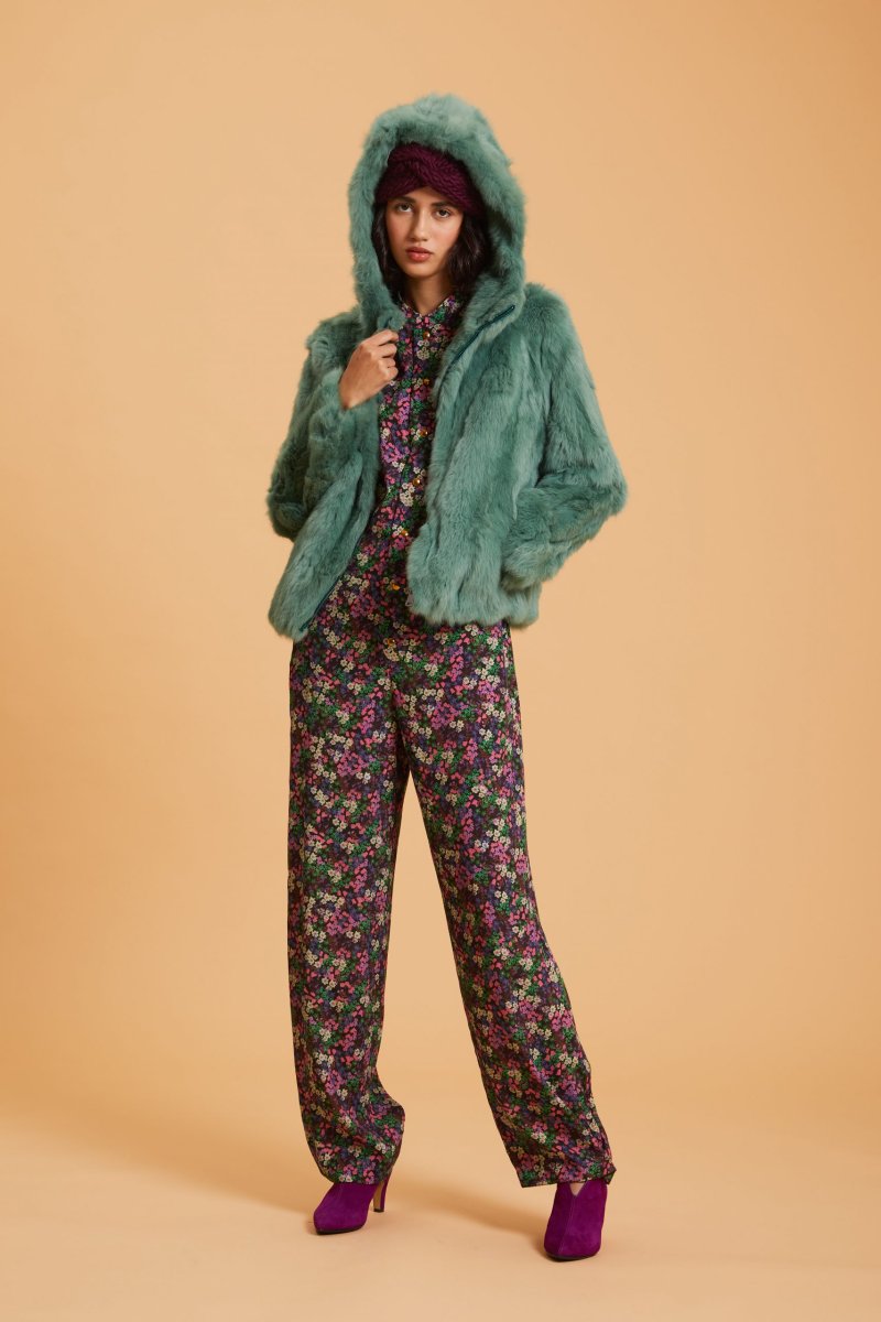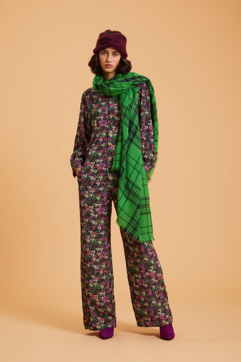 Tuta Alma di Carla Saibene con alette che disegnano la spalla, piccolo colletto alla coreana, pantaloni ampi che possono essereย chiusi sul fondo con bottoni in viscosa stampata a fiori. Vedi altre varianti 100% viscosa Made in Italy Elastico in vita sul retro che disegna la silohuette Vestibilitร morbiba: Ana รจ alta 176 cm e porta una taglia 40 Taglia italiana Esiste in diversi tessuti e varianti