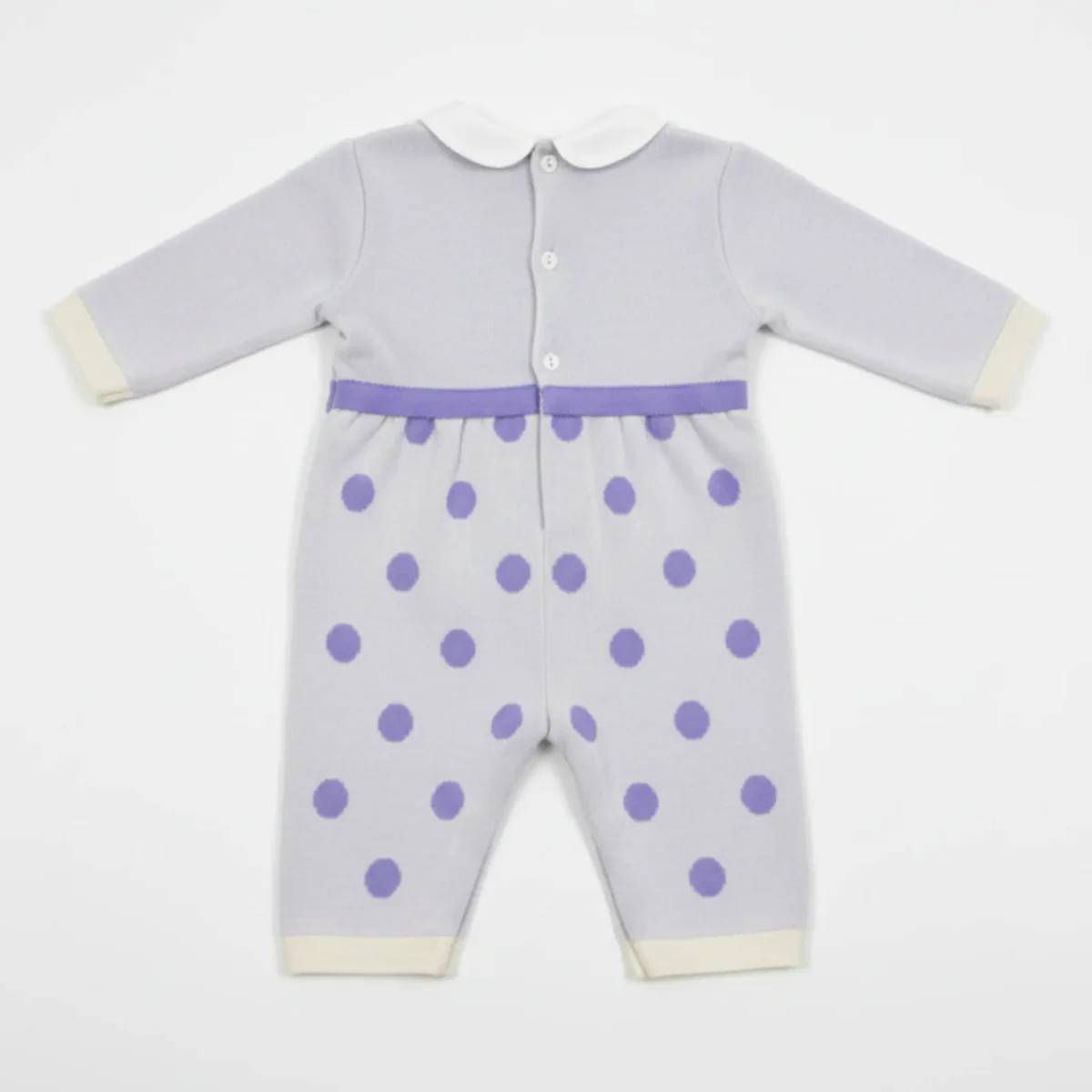 I pois lilla aggiungono un tocco di colore discreto, rendendola un pezzo unico per un corredino neonata raffinato.