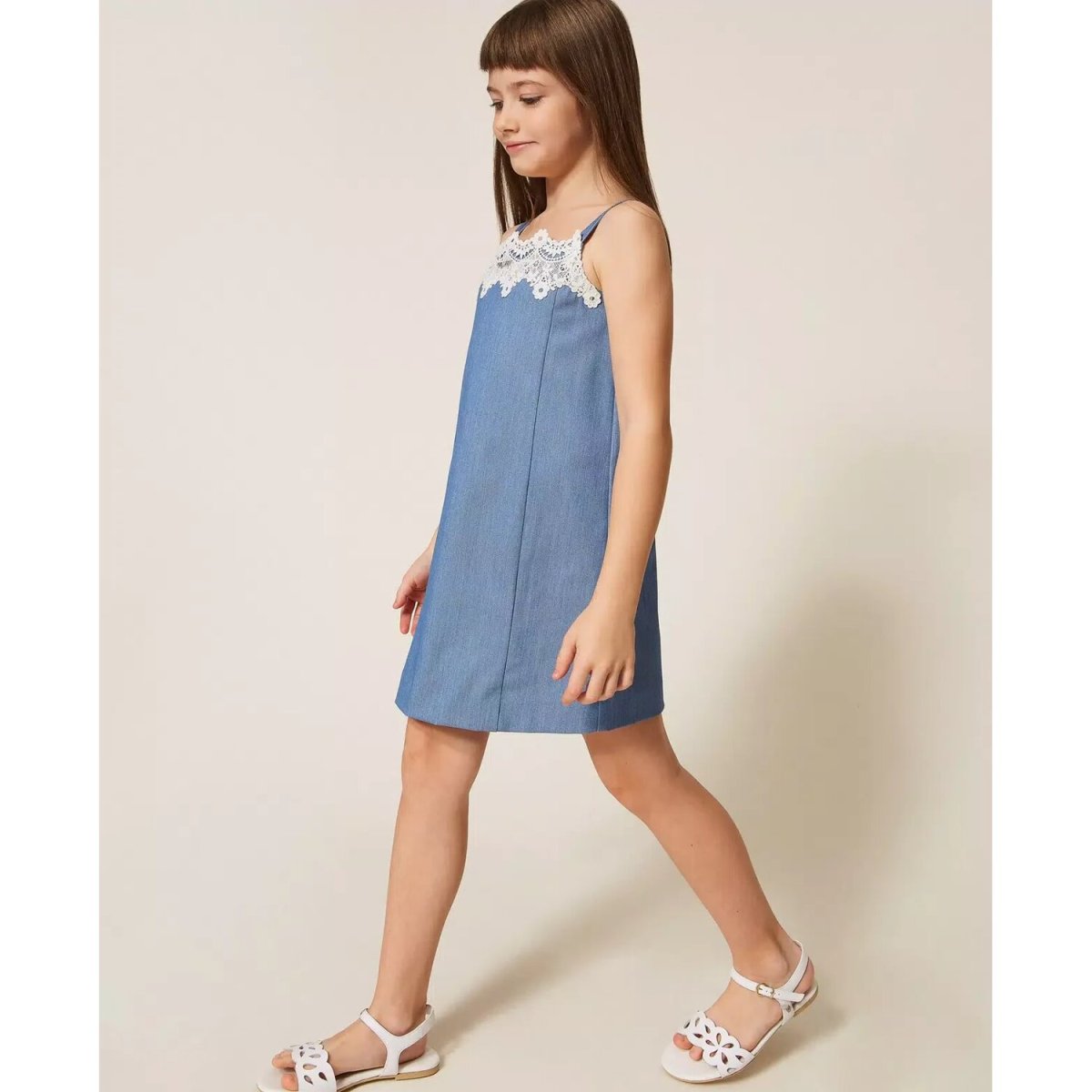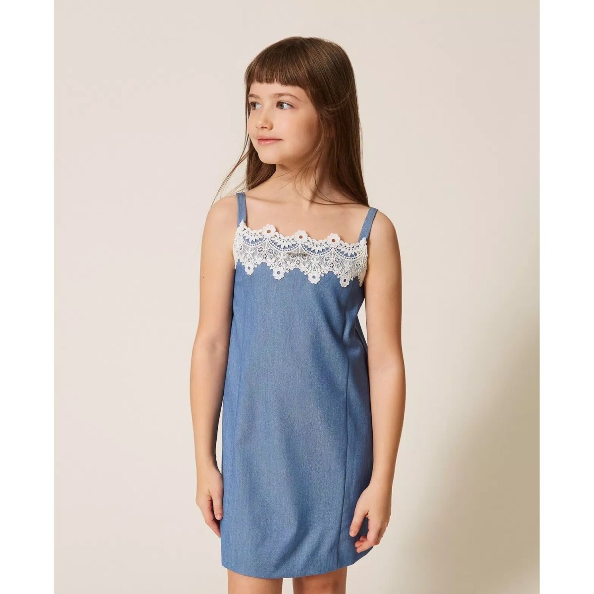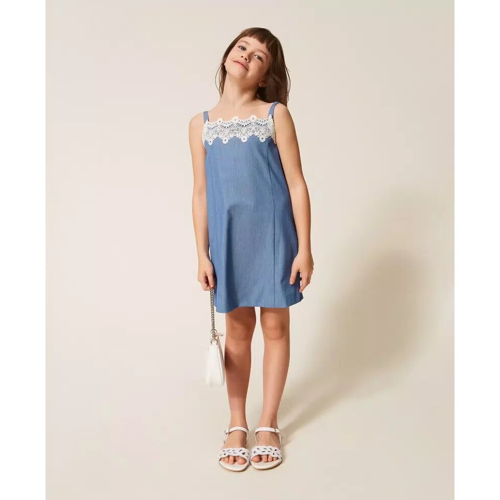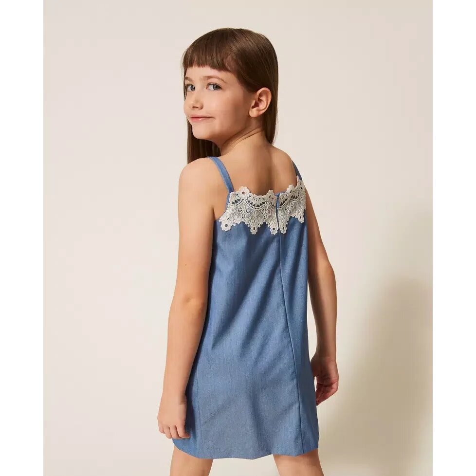 Abito corto da bambina in tessuto a tela di misto viscosa fil-à-fil con pizzo applicato allo scollo. Ha spalline, tagli verticali davanti, chiusura con zip sul retro, linea dritta.
