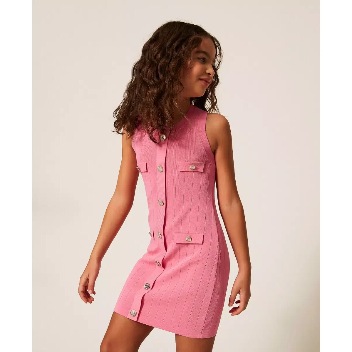 Abito corto da bambina in maglia di viscosa rasata con collo tondo, pattine e bottoni logati in metallo, linea fitted.