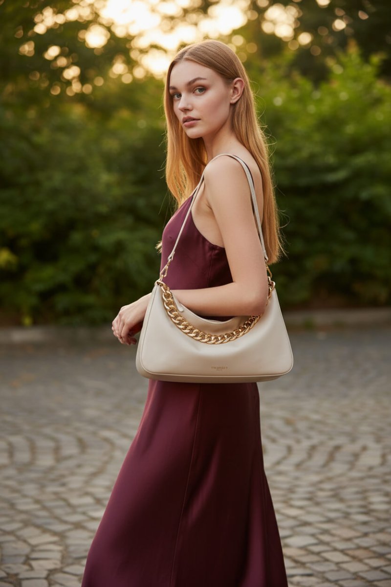 Borsa hobo media ‘Liliane’ made in Italy, realizzata in pelle di vitello liscio pieno fiore con trattamento anti goccia e antigraffio. Il corpo รจ realizzato a colonna, con logo impresso a caldo, e foderato con un twill in misto cotone. Ha due manici staccabili, da indossare simultaneamente o separati per diverse interpretazioni di styling: uno in pelle sagomato e imbottito, l’altro รจ una catena in lega leggera in galvanica oro.