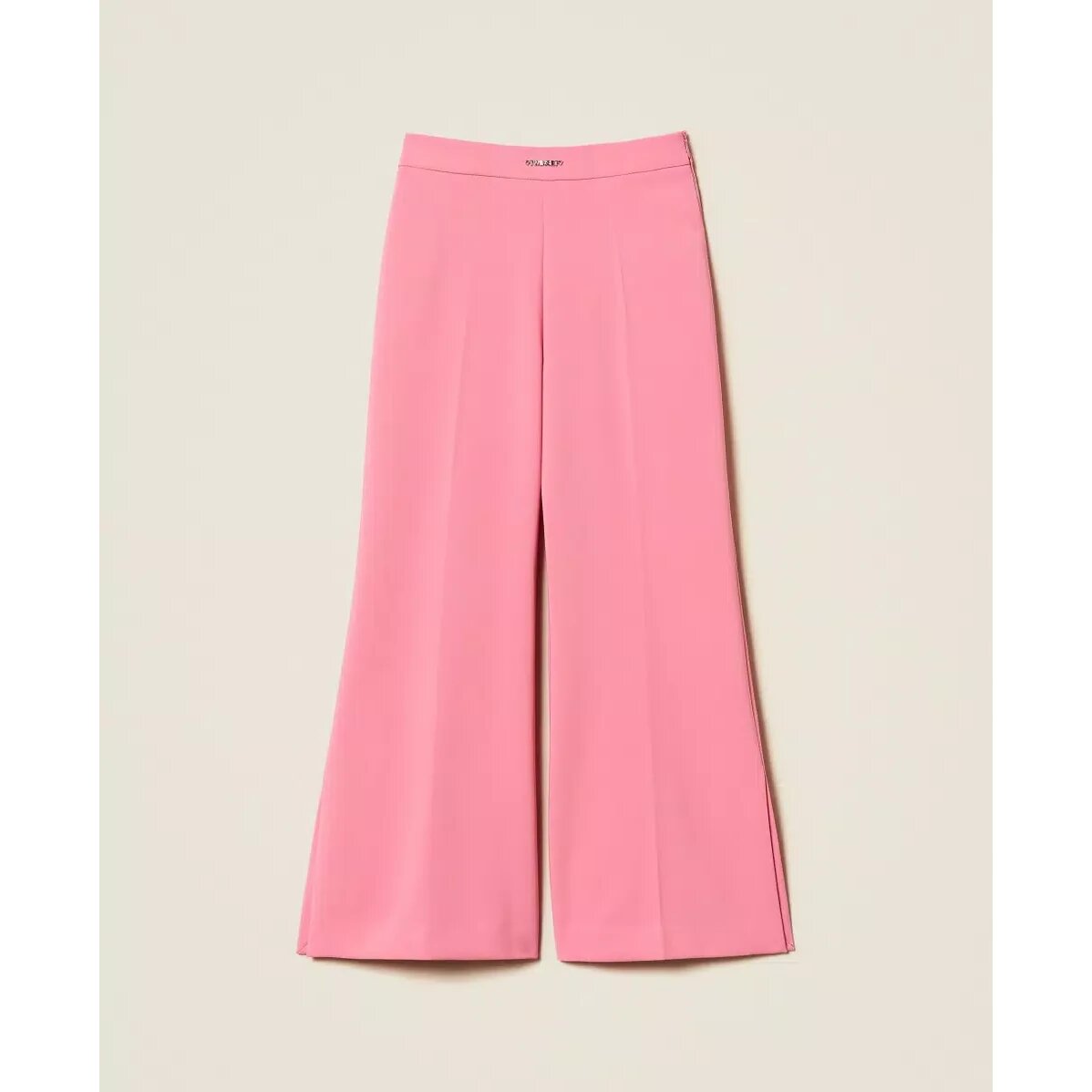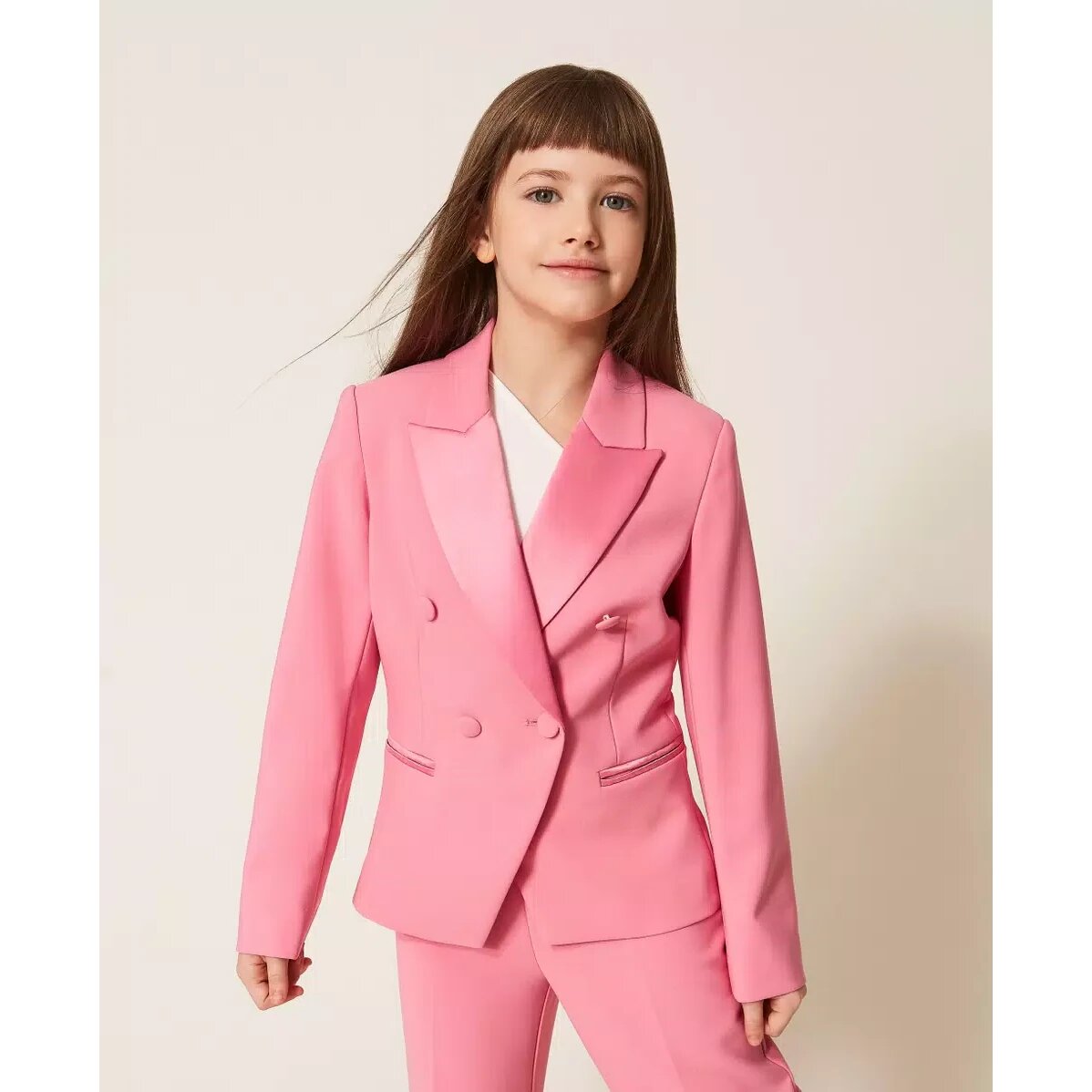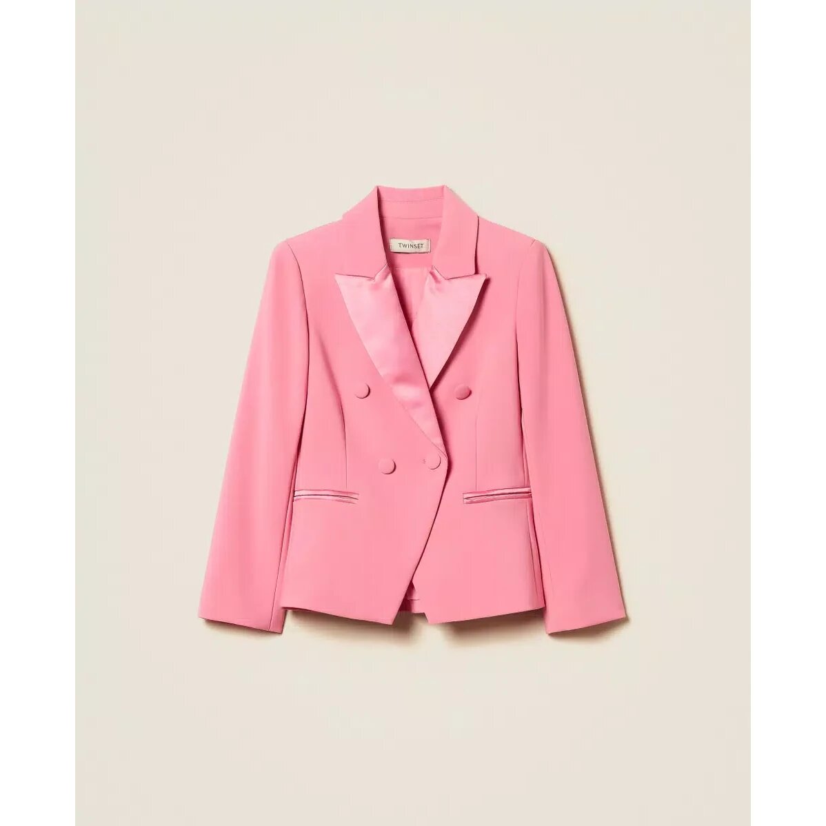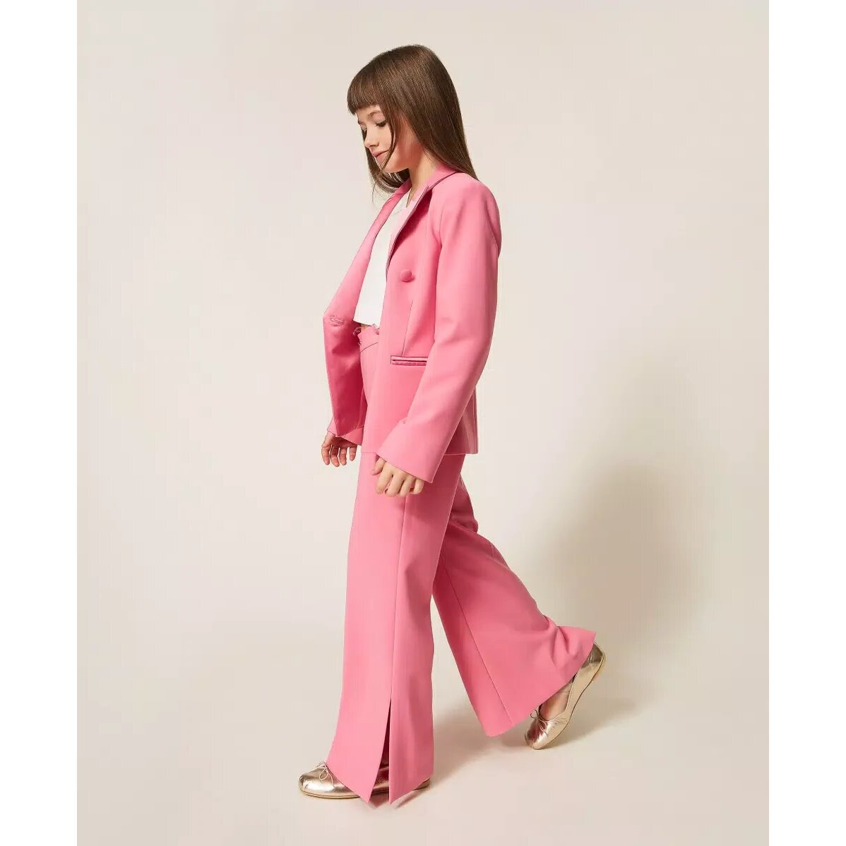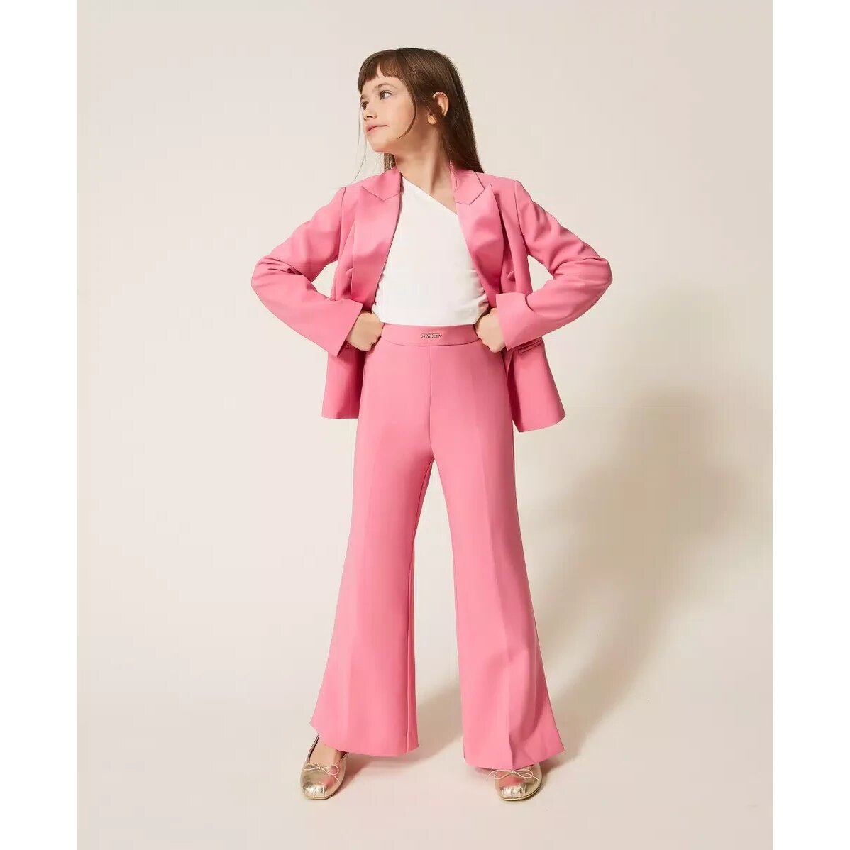 Completo composto da: Giacca blazer in crêpe con dettagli in duchesse. Ha collo con revers, chiusura doppiopetto con bottoni, tasche a filetto, tagli fianchetto davanti e dietro, fodera, linea slim Pantaloni in crêpe con spacchi al fondo. Hanno elastico inserito in vita sul retro, chiusura con zip invisibile al fianco, linea flare.