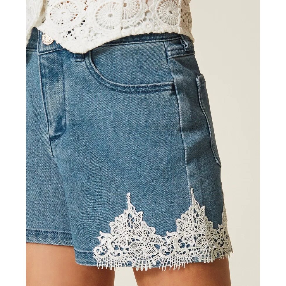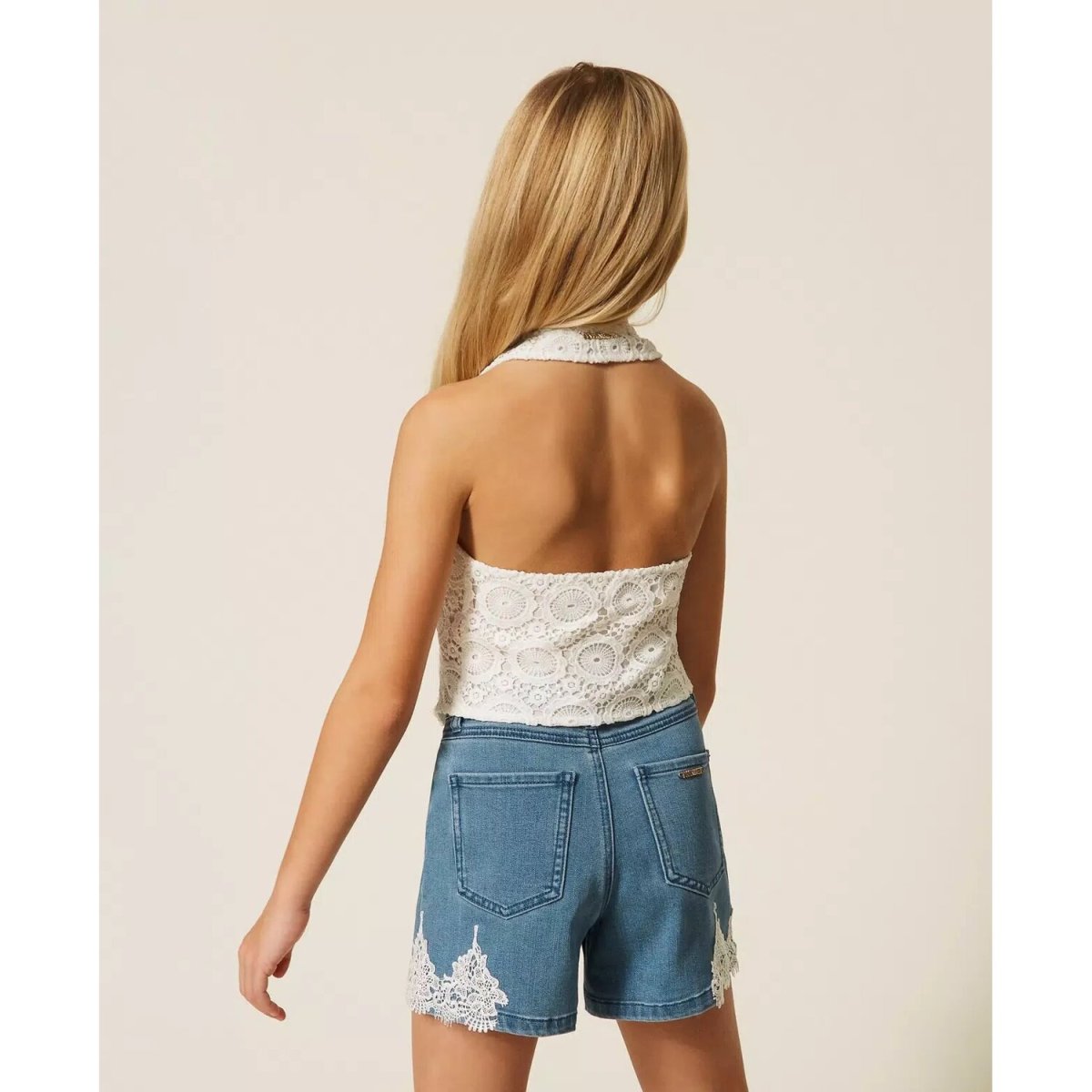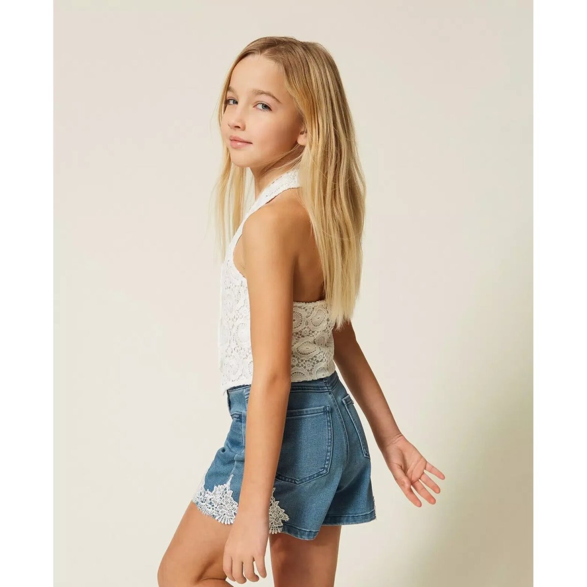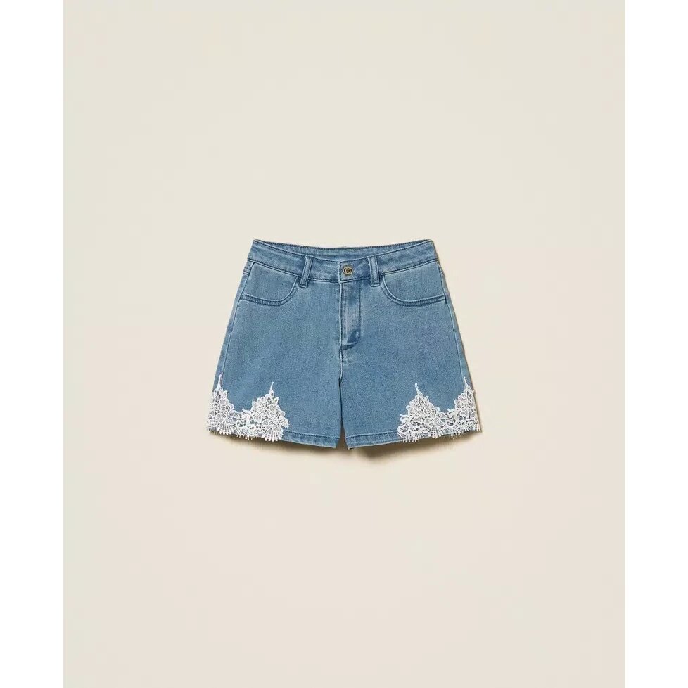 Shorts da bambina in jeans stretch con applicazione di pizzo smerlato al fondo. Hanno passanti in vita, chiusura con zip e bottone logato, cinque tasche, impunture in tono, lavaggio medio, linea dritta.