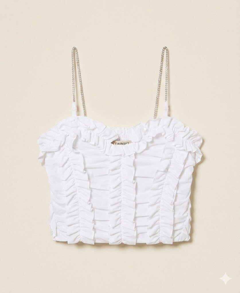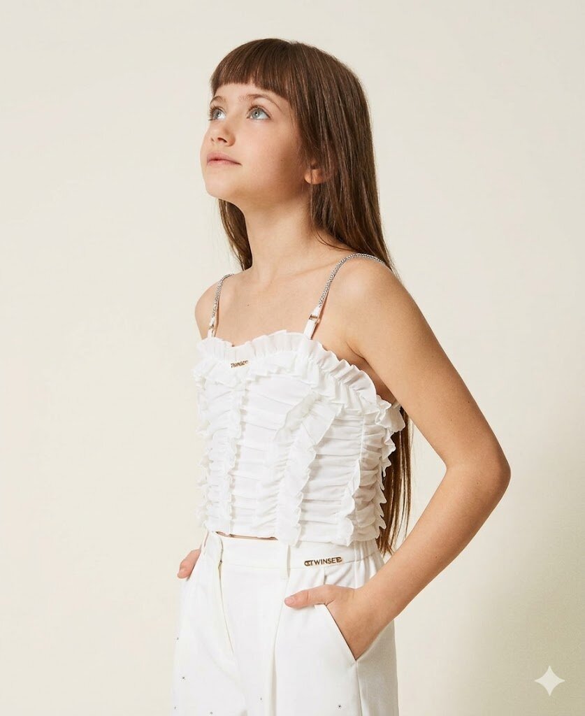 Top da bambina in tulle stretch con volant arricciati e spalline rimovibili e regolabili con strass. Ha chiusura con zip invisibile sul retro, fodera in jersey di cotone stretch, linea fitted.