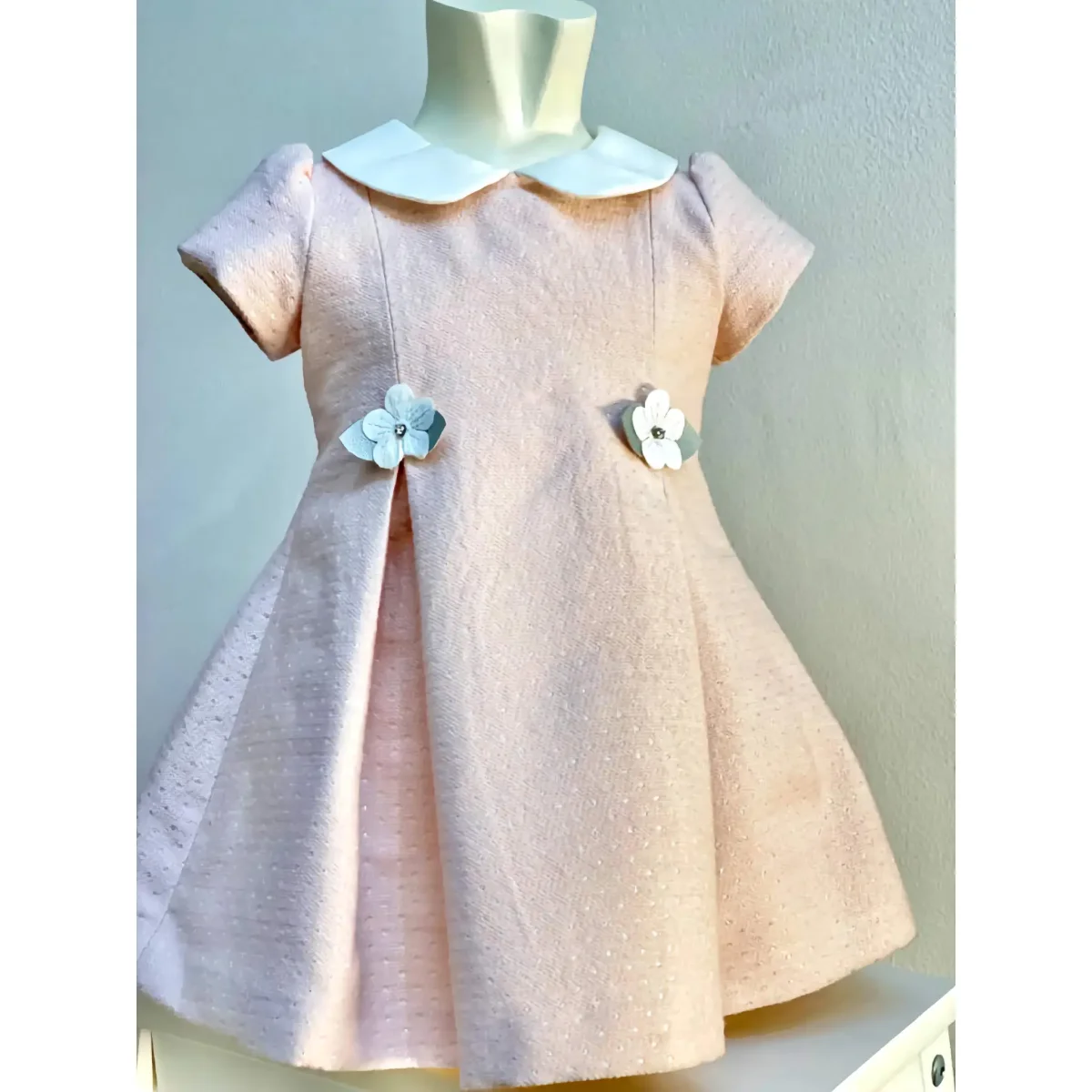 Il design del vestito รจ impreziosito da due delicati e piccoli fiori che segnano il punto vita, aggiungendo un tocco di dolcezza e rendendo l’abito ancora piรน speciale.