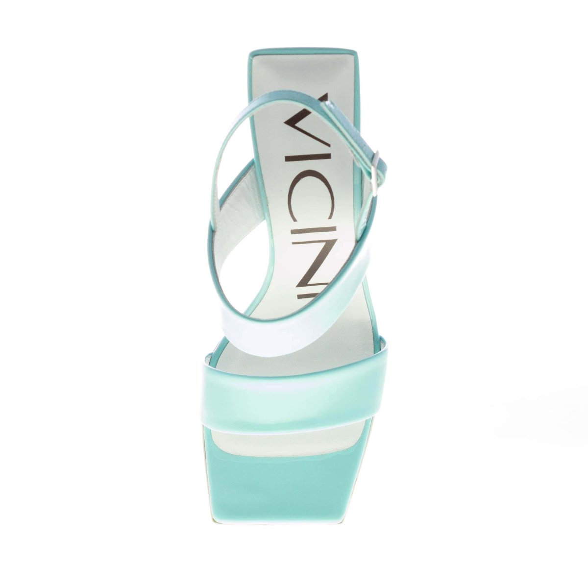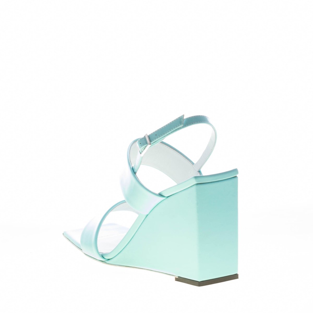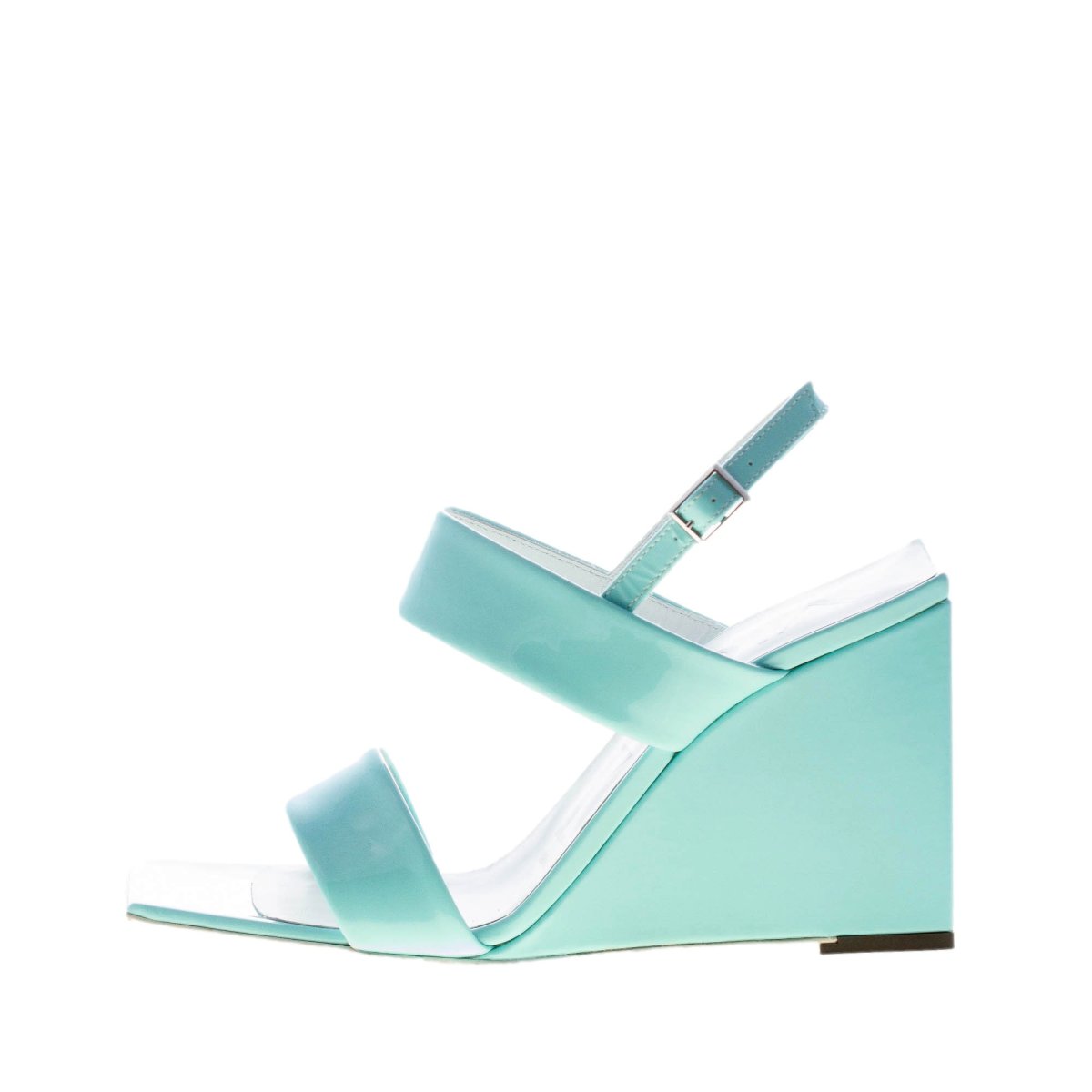 Sandalo con zeppa in vernice turchese con doppia fascia sul piede e sulla punta squadrata. Chiusura con cinturino al tallone. Suola in cuoio. Zeppa geometrica di 9 cm
