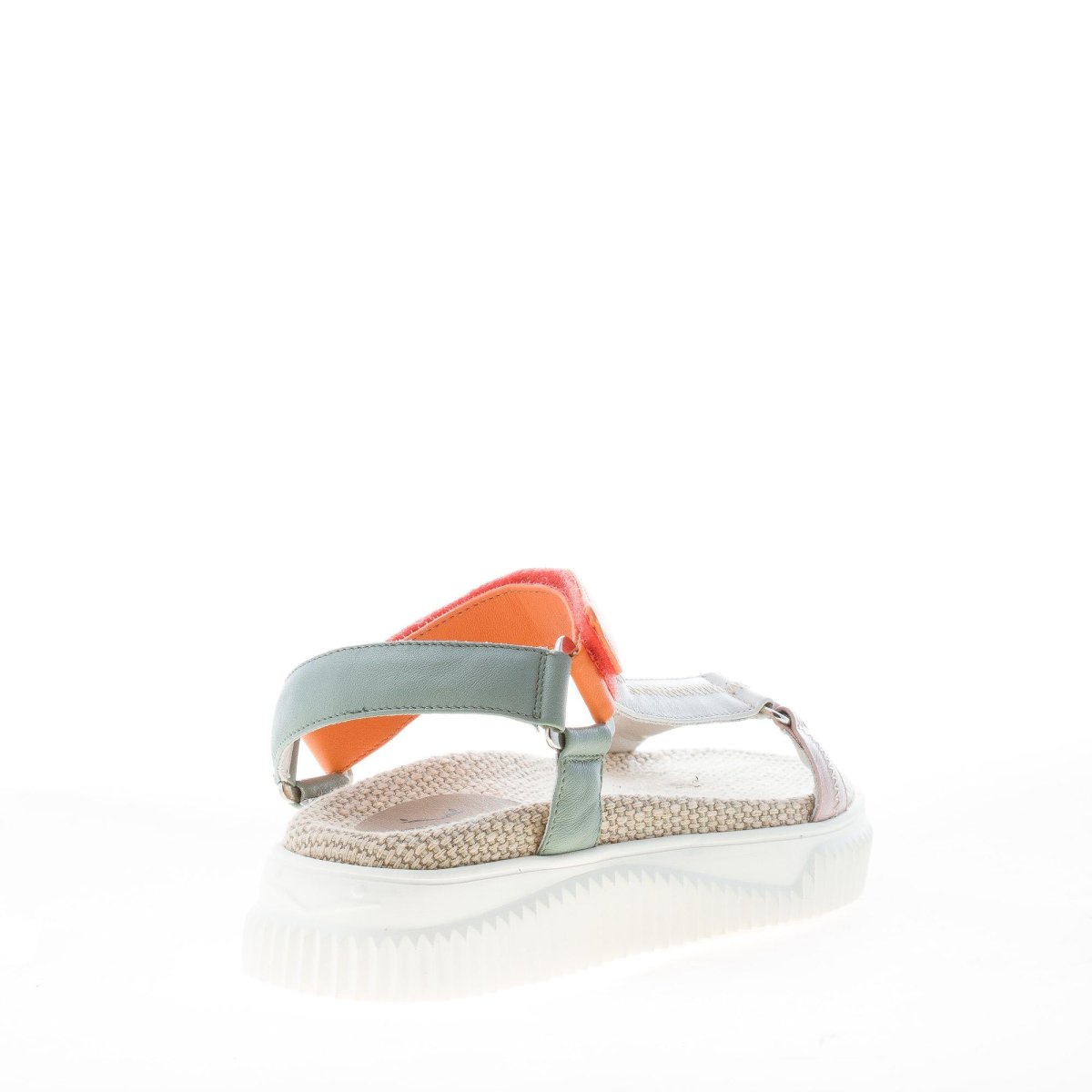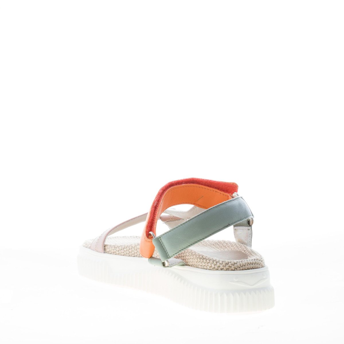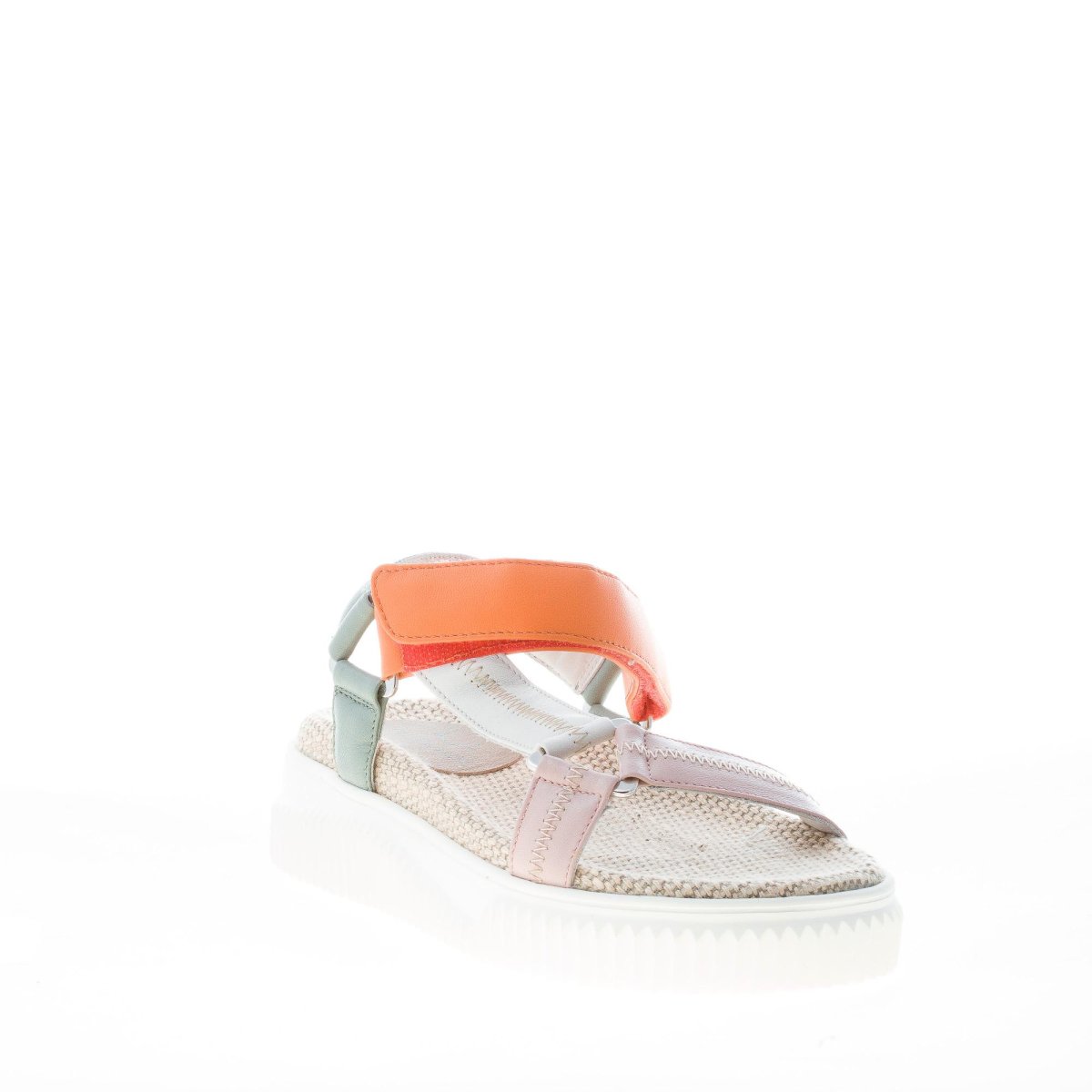 Sandalo sportivo Lisa 20 realizzato con tomaia di cinturini in nappa multicolore su tonalitร di rosa, bianco, arancione. Chiusura a strappo. Suola in gomma con profilo zigrinato